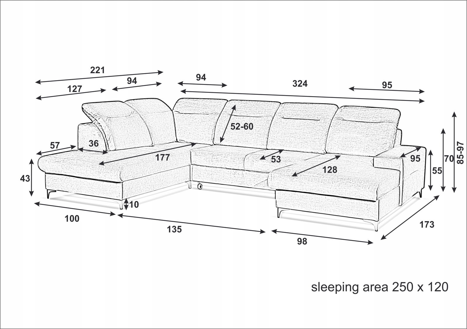 - Funkcja spania: 250cm x 120cm