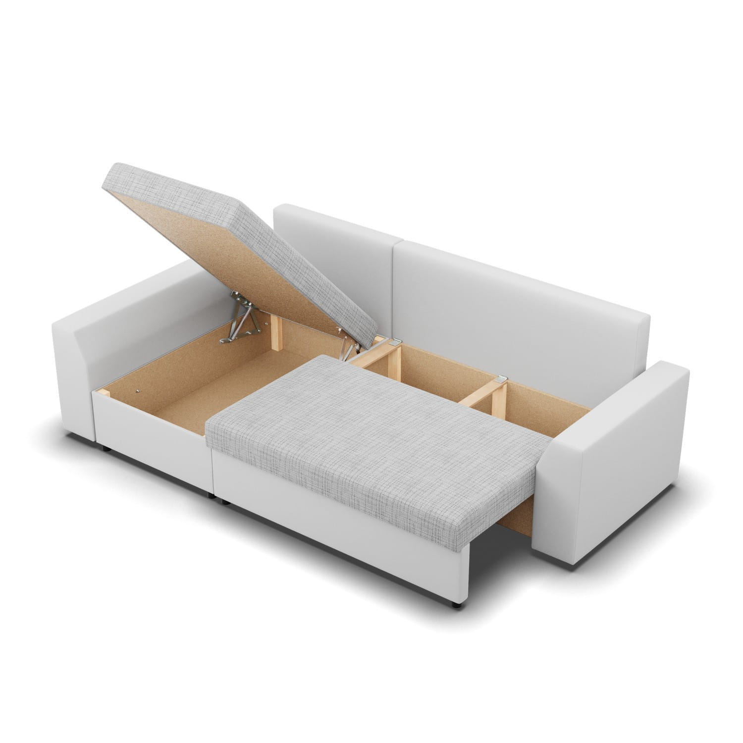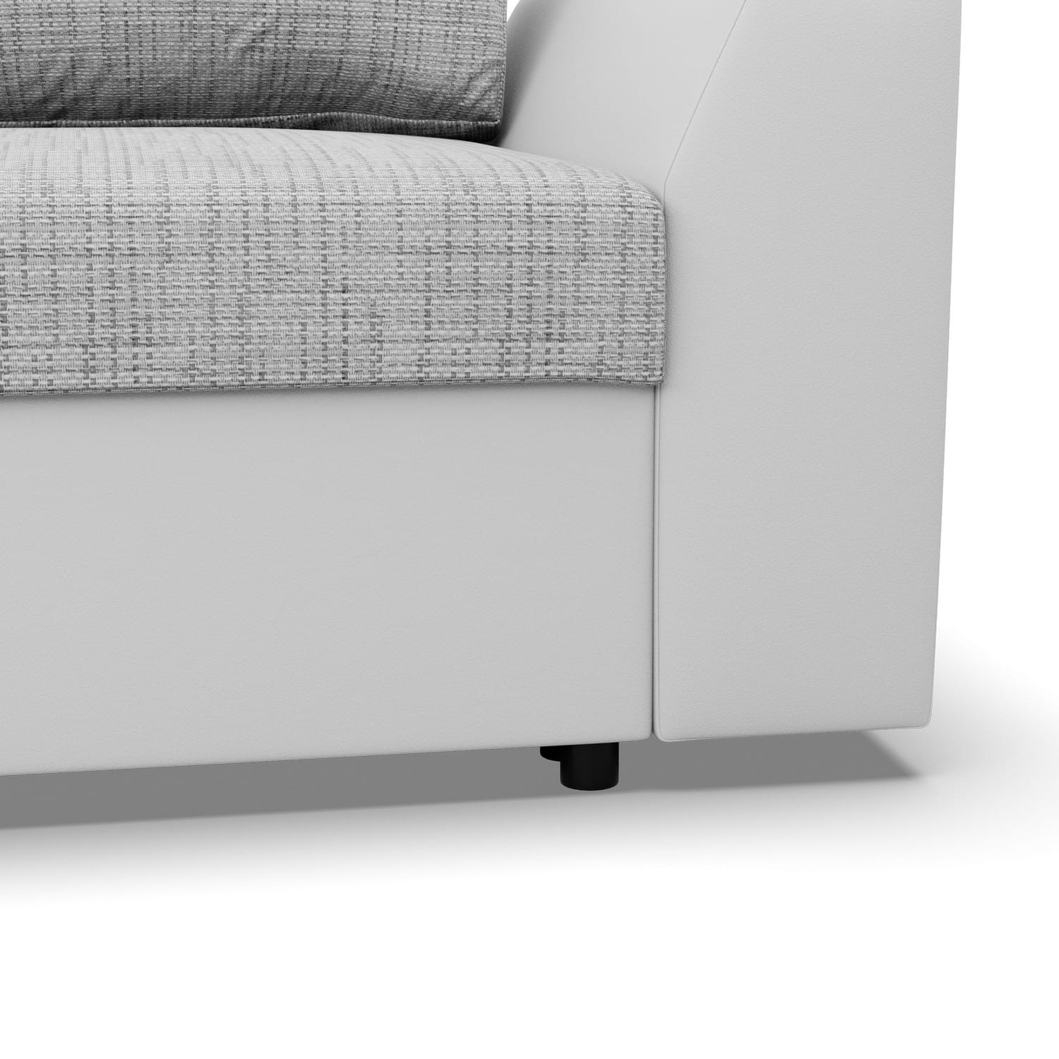Narożnik z funkcją spania, Viktor, ekoskóra, 243x140x92 cm, biel, szary. Zadbaj o kącik wypoczynkowy z komfortowym narożnikiem VIKTOR! Nowoczesny narożnik w kształcie litery L świetnie sprawdzi się w dużym salonie lub pokoju dziennym, oszałamiając swoją estetyką. Klasyczna forma narożnika połączona z funkcjonalnymi rozwiązaniami technologicznymi w postaci podłokietników, luźnych poduszek i dwóch pojemników na pościel będzie idealną ozdobą i jednocześnie miejscem spotkań z rodziną i przyjaciółmi.