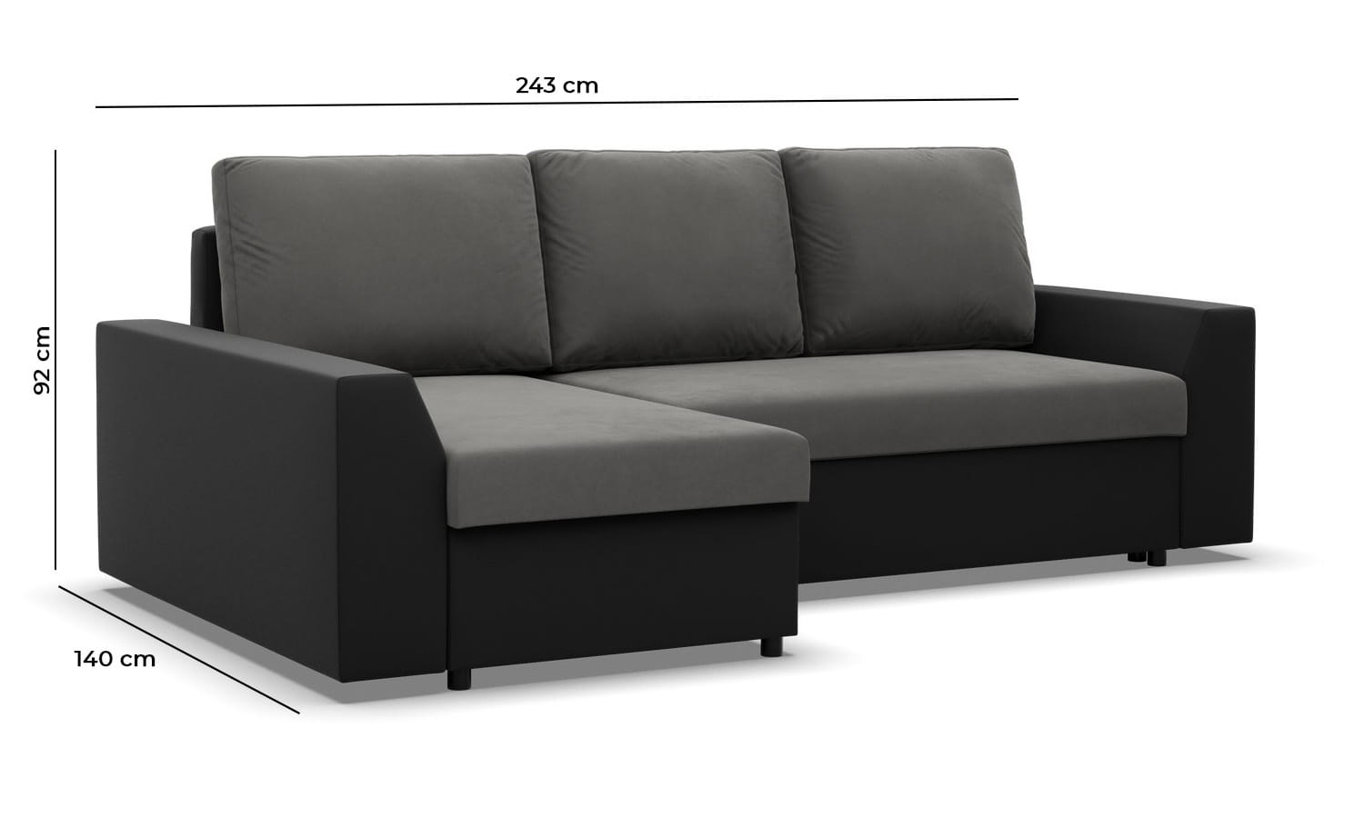 Narożnik z funkcją spania, Viktor, ekoskóra, 243x140x92 cm, czarny, popiel. Zadbaj o kącik wypoczynkowy z komfortowym narożnikiem VIKTOR! Nowoczesny narożnik w kształcie litery L świetnie sprawdzi się w dużym salonie lub pokoju dziennym, oszałamiając swoją estetyką. Klasyczna forma narożnika połączona z funkcjonalnymi rozwiązaniami technologicznymi w postaci podłokietników, luźnych poduszek i dwóch pojemników na pościel będzie idealną ozdobą i jednocześnie miejscem spotkań z rodziną i przyjaciółmi.