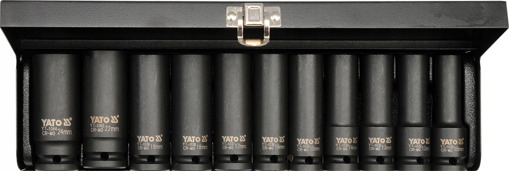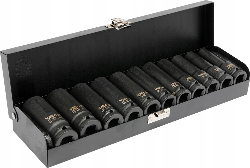 Nasadki udarowe Yato długie - komplet 11 kluczy nasadowych. Specjalistyczne nasadki udarowe, współpracują z urządzeniami pneumatycznymi, które pracują w bardzo ciężkich warunkach pod zmiennymi obciążeniami.