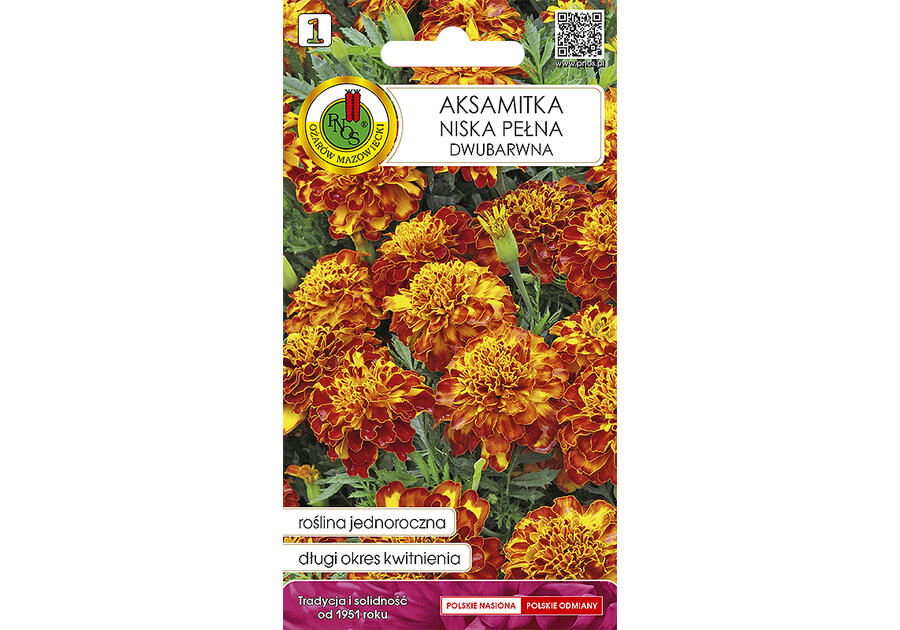 Szczegóły Roślina jednoroczna. Kwiaty dwubarwne, pełne o średnicy 4-5 cm. Odmiana wczesna, obficie i równomiernie kwitnąca. Wysiew nasion w kwietniu pod osłonami lub w maju wprost do gruntu. Na miejsce stałe wysadzać w końcu maja. Kwitnie: czerwiec - październik. Doskonała na rabaty, obwódki, kwietniki, balkony. Posiada właściwości ochronne - zwalcza nicienie. Udaje się na każdej glebie ogrodowej.