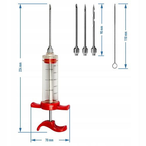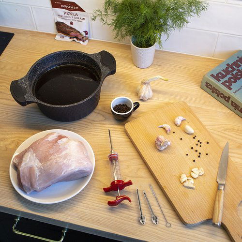 - Profesjonalny zestaw do nastrzykiwania mięs i wędlin - idealny do aplikowania zalewy peklującej, przydatny w kuchni każdego miłośnika domowego wędliniarstwa.