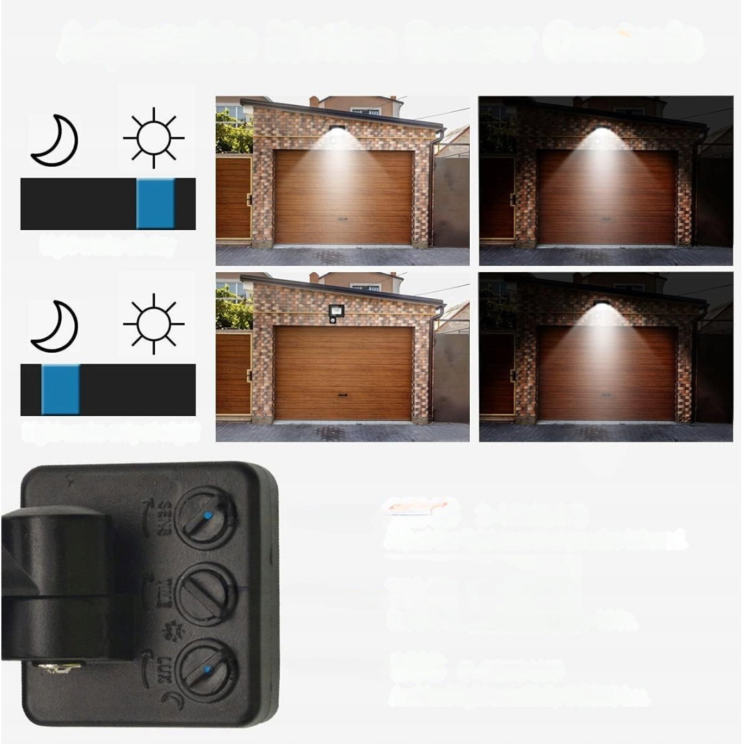 - Trzy tryby regulacji: reflektor LED posiada tryby TIME, SENS i LUX. Czas świecenia (180 sekund), zasięg wykrywania (12 metrów) i czułość światła (dzień/noc) można ustawić w trzech trybach ogólnych. Kąt świecenia wynosi 120°, co zapewnia dobrą widoczność, brak migotania i opóźnień.