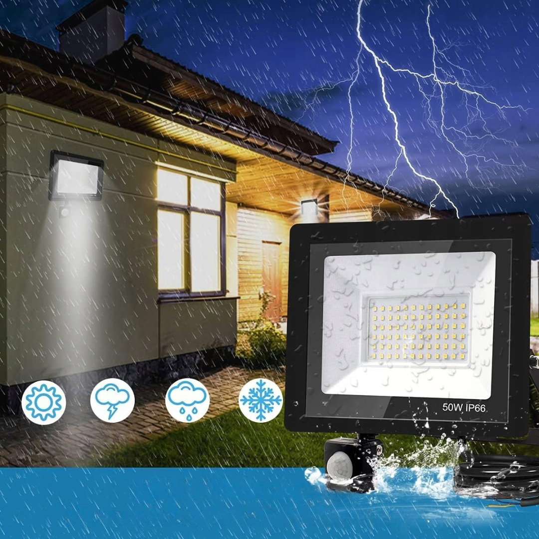 - Automatyczne oświetlenie LED: reflektor LED z czujnikiem ruchu uruchamia się automatycznie po wykryciu ruchu. Oświetlenie indukcyjne 50 W generuje do 5000 lm, a światło o temperaturze 3500 K zapewnia szeroki zakres jasnego, ciepłego oświetlenia. Lampa posiada kabel o długości 75 cm, ułatwiający instalację.