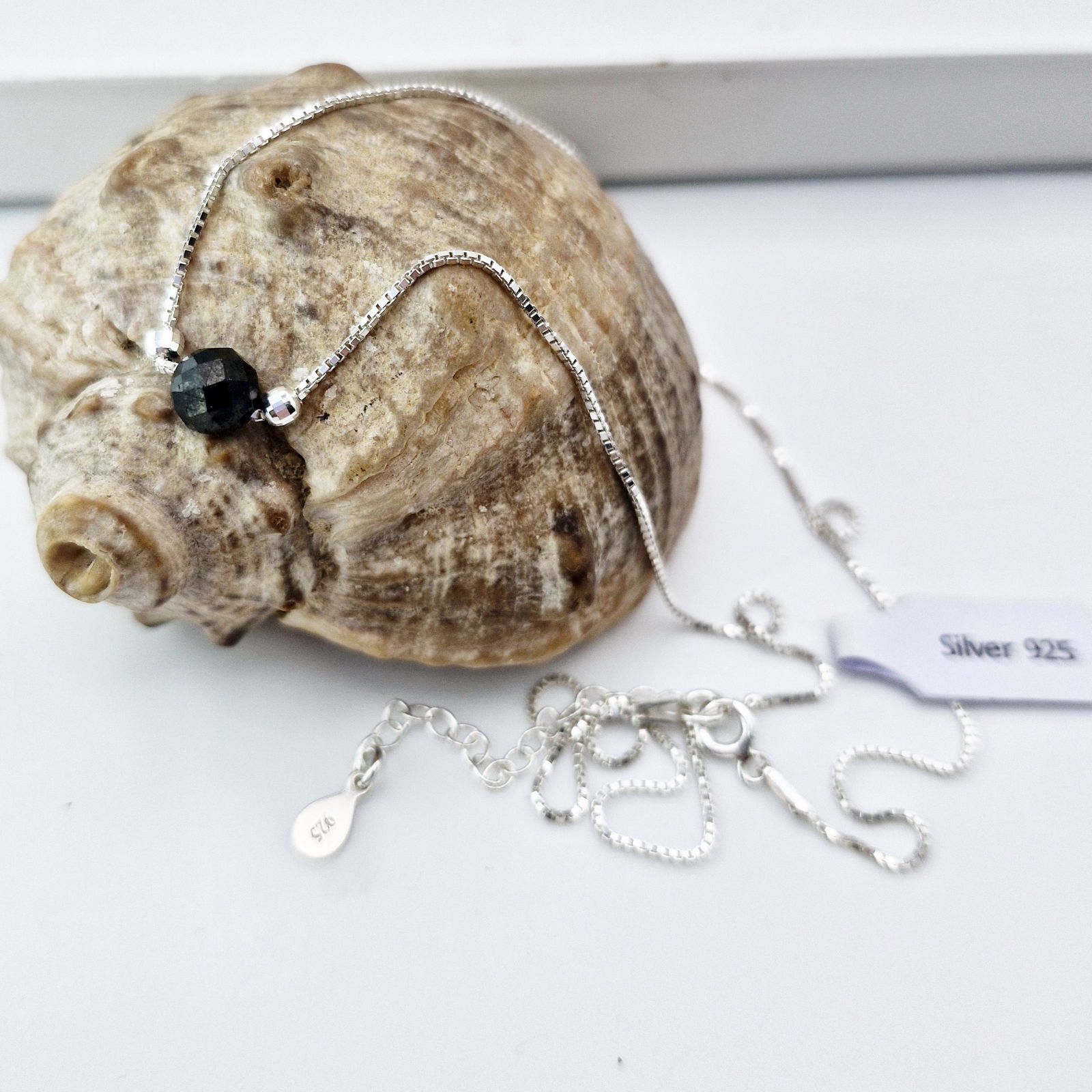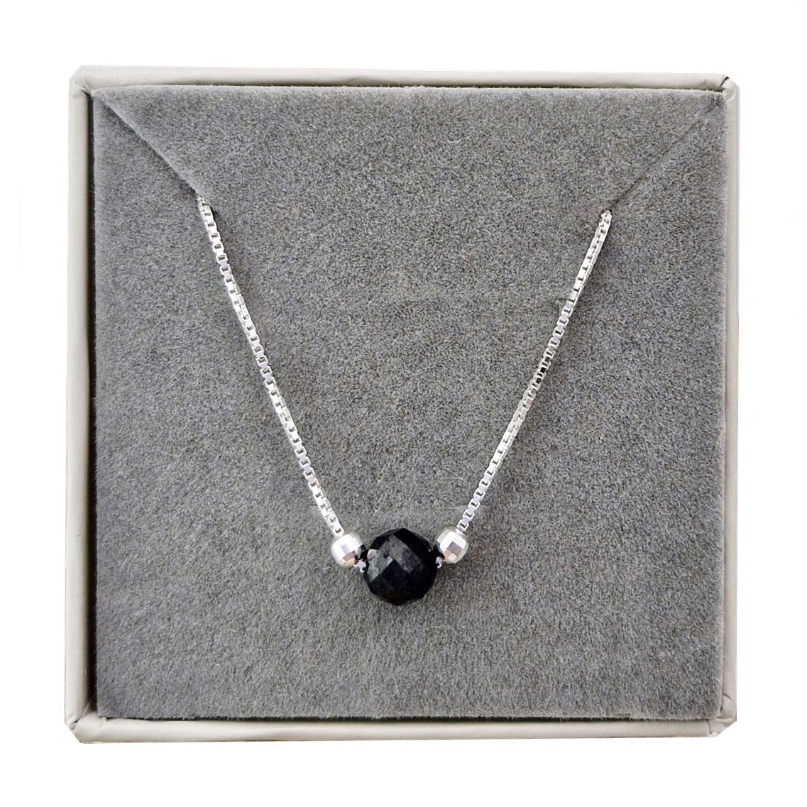 Oferujemy Państwu naszyjnik z naturalnym kamieniem - czarnym turmalinem zawieszonym na łańcuszku o pięknym splocie oraz ozdobnymi kuleczkami. Naszyjnik wykonany ze srebra próby 925.