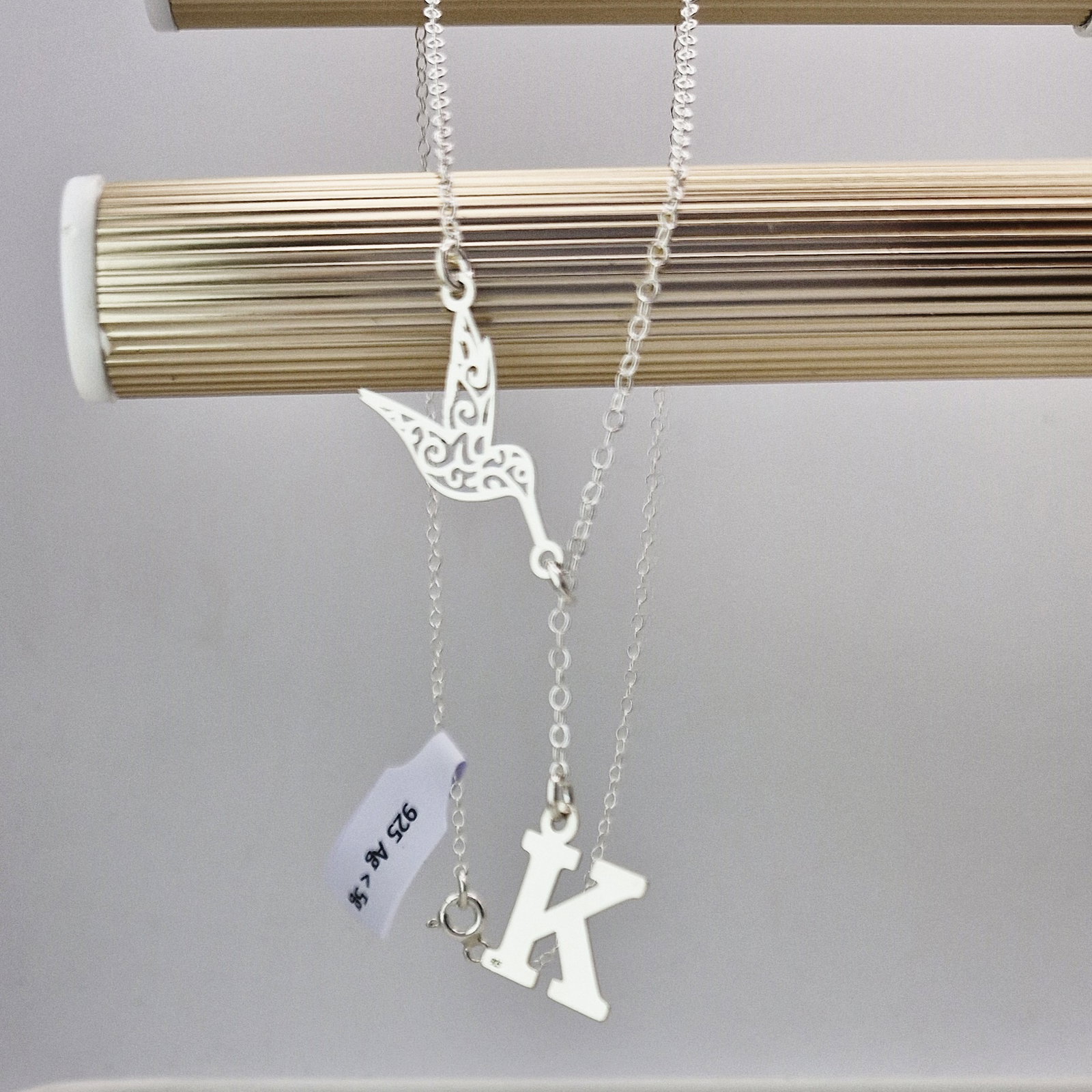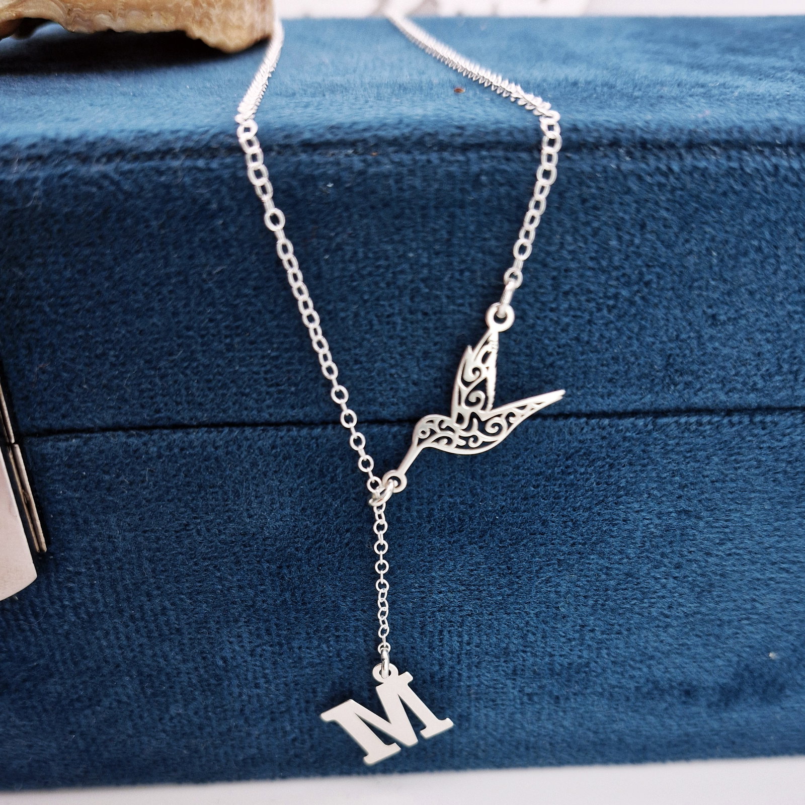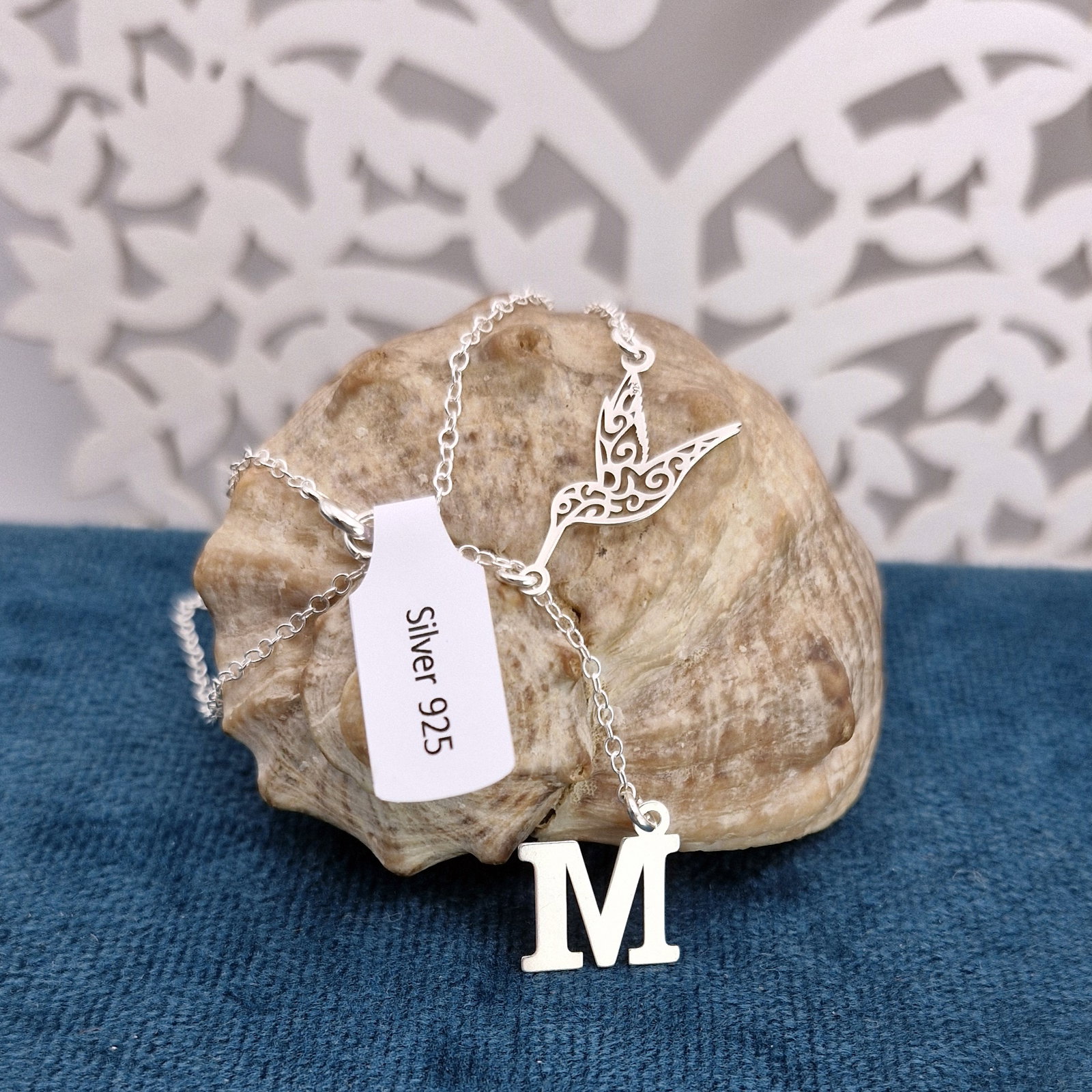 Oferujemy Państwu piękny naszyjnik typu krawat z zawieszkami w kształcie ażurowego koliberka oraz literki, wykonany w całości ze srebra próby 925.