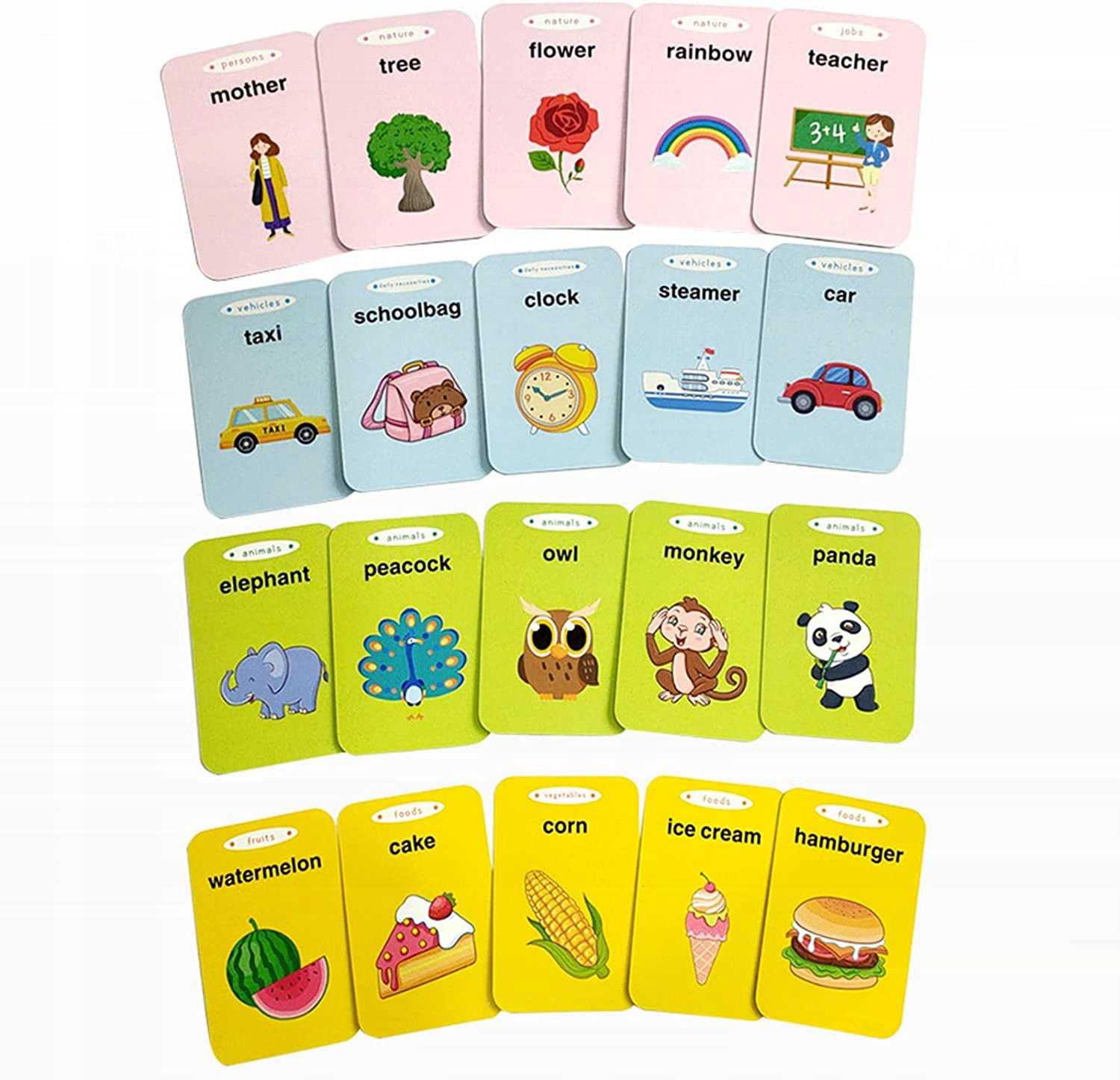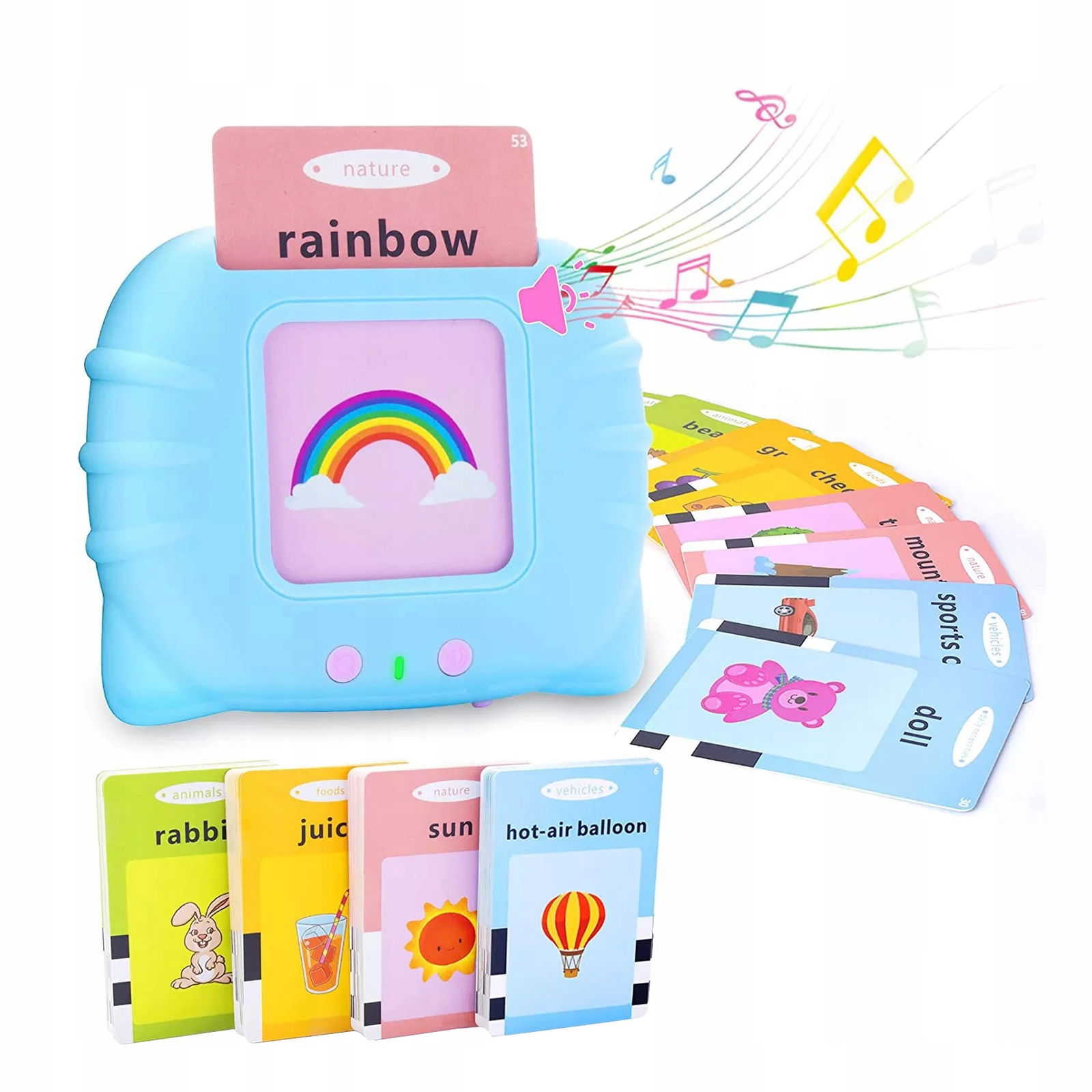 Każda karta posiada dwa wgrane słowa, po jednym na każdą stronę, oraz odpowiedni rysunek, który pozwala zrozumieć ich znaczenie. Stymuluje to zarówno wzrok i słuch dziecka, dzięki czemu z pewnością dopasuje się do najefektywniejszego sposobu uczenia się każdego Malucha.