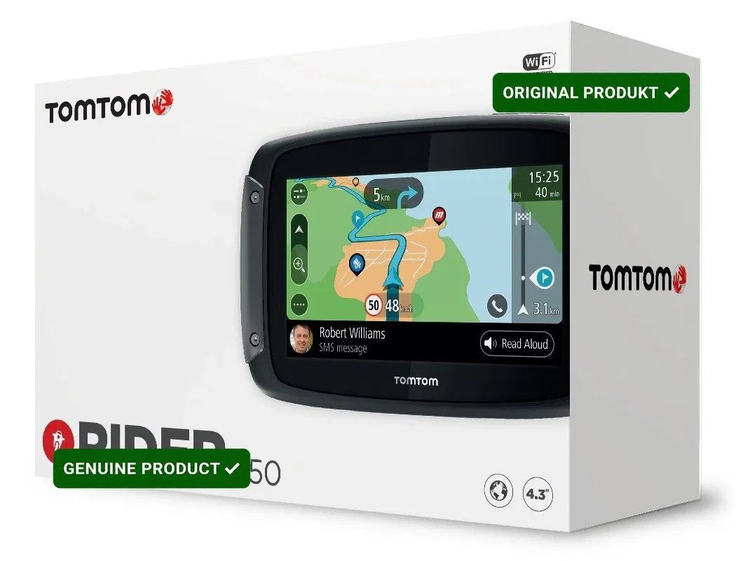 Wytrzymałe urządzenie TomTom Rider o metalowych krawędziach ma odporną na warunki pogodowe i upadki konstrukcję o stopniu ochrony IPX7. Jest wyposażone w szybki czterordzeniowy procesor i uruchamia się nawet pięć razy szybciej. Urządzenie nawigacyjne dla motocykli jest wyposażone w uniwersalny uchwyt RAM, dzięki czemu możesz wyruszyć w drogę szybciej niż kiedykolwiek wcześniej.