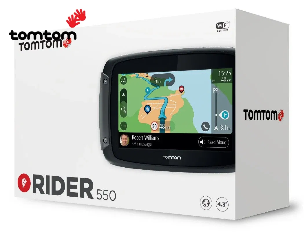 ™ Pierwszą z nowych funkcji jest możliwość aktualizowania nawigacji przez Wi-Fi - bezprzewodowo, bez konieczności podłączania do komputera. Urządzenie zostało wyposażone w usługi Lifetime (Mapy Świata, Traffic i Fotoradary). TomTom RIDER 550 oferuje dostęp do TomTom Road Trips - ponad 150 ekskluzywnych tras dostępnych do pobrania, co będzie przydatne przy planowaniu wyjątkowej podróży. W trakcie jazdy motocykliści zwrócą uwagę na nowy, szybszy, czterordzeniowy procesor, który zapewnia większą wydajność i płynniejszą nawigację, a także docenią możliwość połączenia urządzenia z telefonem i skorzystania z asystentów głosowych: Siri i Google Now . Ponadto wiadomości ze smartfona mogą być odczytywane na głos, za pomocą zestawu słuchawkowego.
