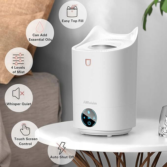 - 【4 Poziomy mgły i przycisk ekranu dotykowego】 Nawilżacz jest wyposażony w duży ekran dotykowy, a objętość natrysku można ustawić na tryb niski, średni, wysoki i automatyczny za pomocą łatwego dotknięcia przycisku zasilania. Dzięki dużej ilości mgły o wielkości mikronów może szybko zapewnić komfortową wilgotność powietrza, ale nie sprawi, że biurko lub łóżko będzie wilgotne.