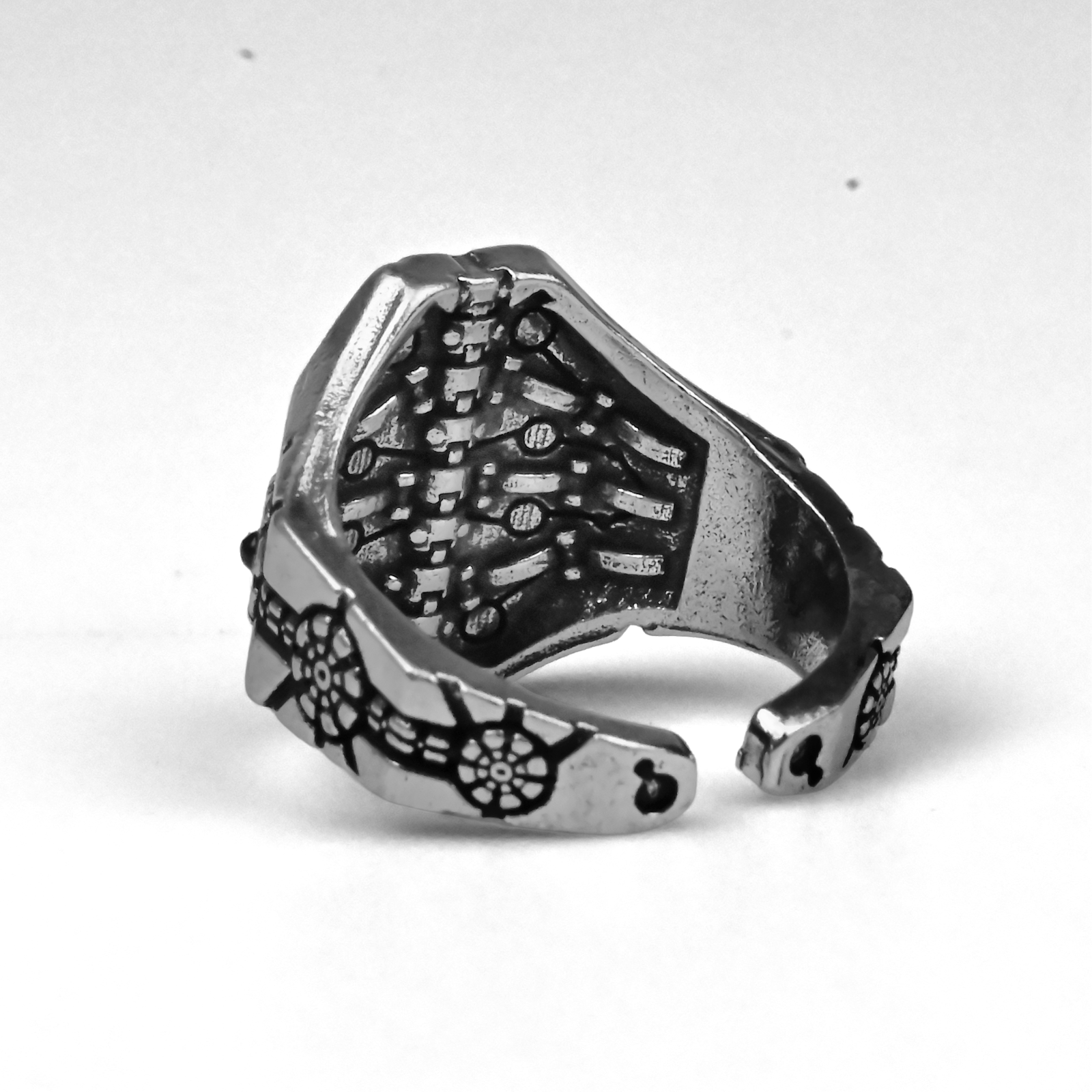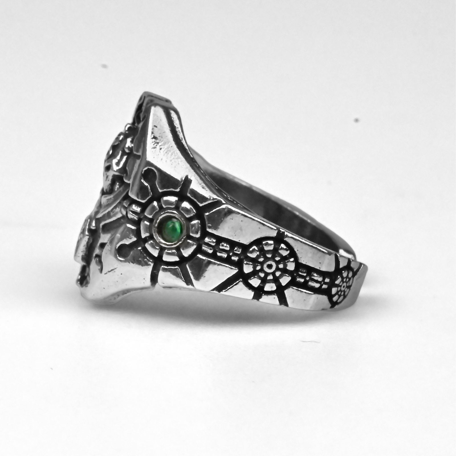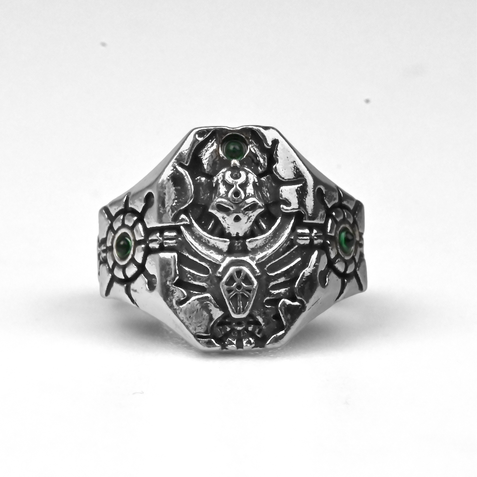 Zainspirowany mrocznym dziedzictwem pradawnych dynastii, kolekcjonerski pierścień Necronów czerpie pełnię estetyki z jednych z najbardziej przerażających istot w uniwersum Warhammer 40k. Wzór oparty na biomechanicznych motywach Necronów symbolizuje potęgę i nieśmiertelność tych, którzy powstali z grobowców, by siać zagładę pośród żywych. Wykonany z trwałego metalu, pierścień ma regulowany rozmiar, co zapewnia wygodne dopasowanie. Centralny motyw przedstawia twarz Necrona, otoczoną starannie grawerowanymi symbolami technologii xenos, wzbogaconymi zielonymi kamieniami imitującymi energię biotransferencji. Połączenie polerowanego srebra i ciemnych oksydowanych linii nadaje pierścieniowi tajemniczy, starożytny wygląd rodem z Krypt Śmierci. Jako wyjątkowy element noszony na co dzień lub część kolekcji, ten merch Warhammer 40k będzie idealnym wyborem dla fanów milczącego króla i jego legionów. To pierścień, który przemawia językiem wieczności i zagłady.
