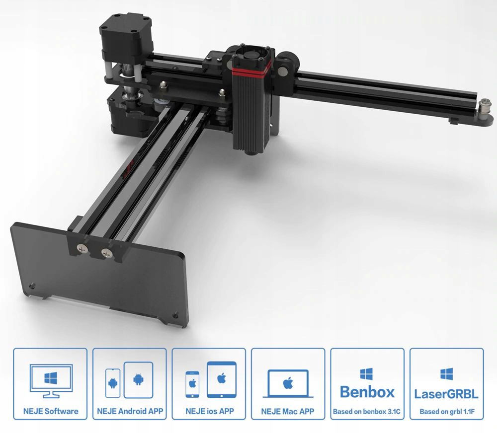 Do obsługi urządzenia można używać oryginalnego i prostego oprogramowania NEJE (Windows oraz Mac) lub GBRL. Urządzenie może bezpośrednio wykorzystać BMP, JPG, PNG oraz pliki w innym formacie, można także wstawić tekst i edytować tekst bezpośrednio, aby osiągnąć pełne odwzorowanie. Urządzenie obsługuje maksymalnie 255 mm x 440 mm, odległość punktu wynosi 0.075mm. Oprogramowanie obsługuje podstawowy G-CODE (.nc) (Inkscape) oraz podstawowe funkcje CAD (.dxf)