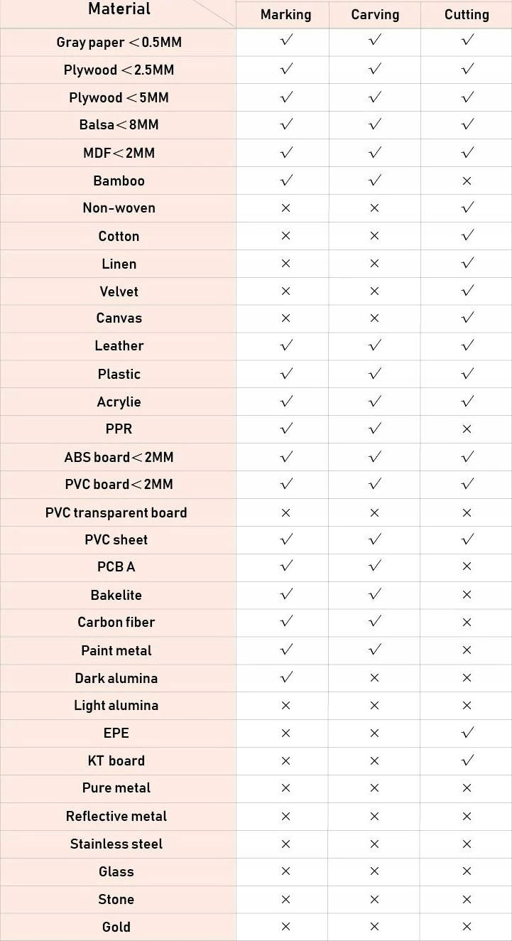 Grawer ten jest nowoczesnym połączeniem technologii laserowej oraz drukarki. W zależności od mocy lasera pozwala grawerować i przepalać różne materiały: drewno, bambus, papier, karton, plastik, gumę, skórę, lakier, malowany metal, PCBA, kość, mahoń. Model 3500 mW jest idealny do odtwarzania skali szarości. Model 7 W i wyższe potrafią znaczyć w kolorowym metalu - w zależności od twardości materiału, stopnia odbicia światła, stopnia przeźroczystości oraz koloru.