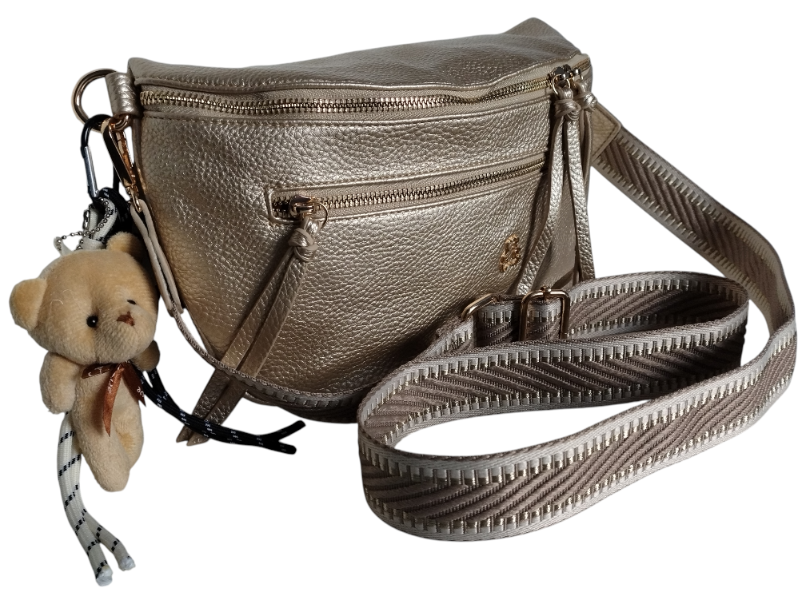 Nerka Damska na Ramię z Zawieszką Miś Miejska Torebka Damska 2 Paski Złoty