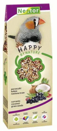 HAPPY BY NATURE – idealnie dopasowany i zbilansowany pokarm klasy PREMIUM z porzeczkami, kokosem i nasionami traw, został specjalnie przygotowany z myślą o ptaszkach egzotycznych.Mieszanka pozbawiona sztucznych składników, barwników, konserwantów, starannie dobrana zgodnie z potrzebami i wymaganiami żywieniowymi astryldów, z siłą płynącą wprost z serca natury wspomaga ich zdrowie, kondycję i dobre samopoczucie.Porzeczki są kopalnią witaminy C, która korzystnie wpływa na odporność. Są również źródłem niacyny, potasu oraz pektyn. Mają właściwości przeciwzapalne i pozytywnie wpływają na przemianę materii.Kokos jest źródłem potasu, magnezu, fosforu i kwasu foliowego, a przede wszystkim cennych kwasów tłuszczowych, będących źródłem energii dla organizmu. Błonnik, zawarty w wiórkach kokosowych, jest niezbędny dla prawidłowego funkcjonowania układu pokarmowego.Nasiona traw zawierają węglowodany, będące źródłem energii oraz liczne pierwiastki mineralne, które wchodząc w skład enzymów i hormonów, regulują ważne procesy życiowe.Skład:proso, kanar, proso czerwone, owies bezłuskowy, rzepak, proso senegalskie, siemię lniane, suszone porzeczki 2%, mohair, wiórki kokosowe 1,5%, nasiona traw 1,5%, konopie, mak, murzynek