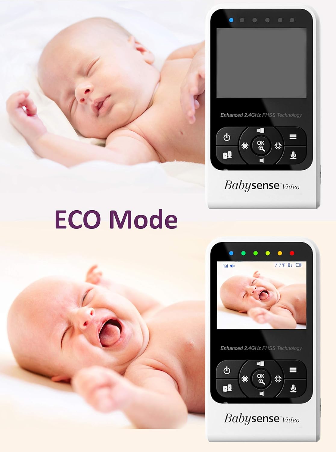 - Nasza niania jest dostarczana z dwiema kamerami, które pozwalają monitorować sen dziecka za pomocą zaawansowanego, kolorowego wyświetlacza LCD o przekątnej 2,4 cala, w połączeniu z ulepszoną technologią FHSS 2,4 GHz. Elektroniczna niania Babysense zapewnia wysoką jakość i stabilne przesyłanie strumieniowe, bezpieczne połączenie bez włamań oraz krystalicznie czysty cyfrowy obraz i dźwięk.