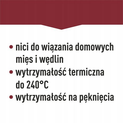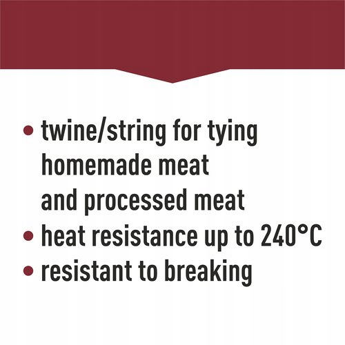 Wytrzymałość termiczna do 240°C - nić umożliwia obróbkę taką jak wędzenie, parzenie, pieczenie bez zmiany aromatu i smaku przygotowywanego mięsa.