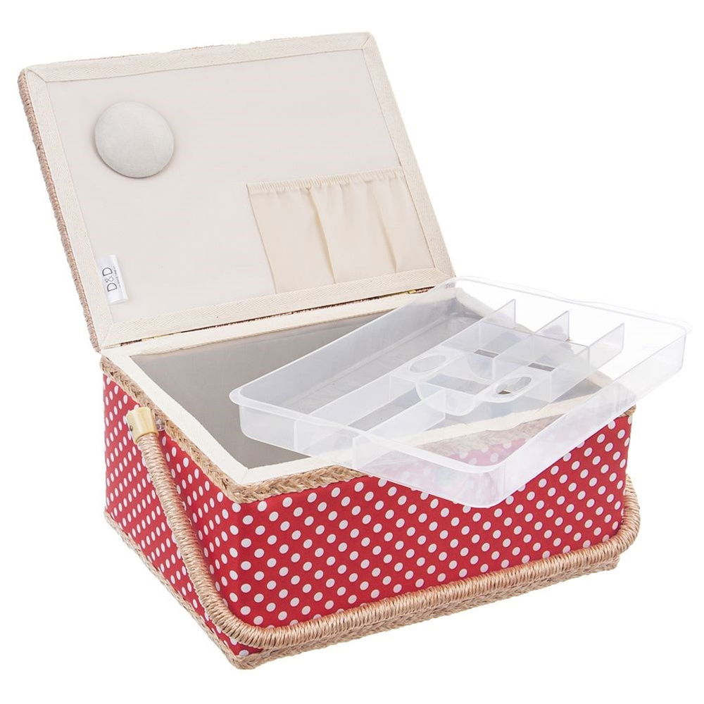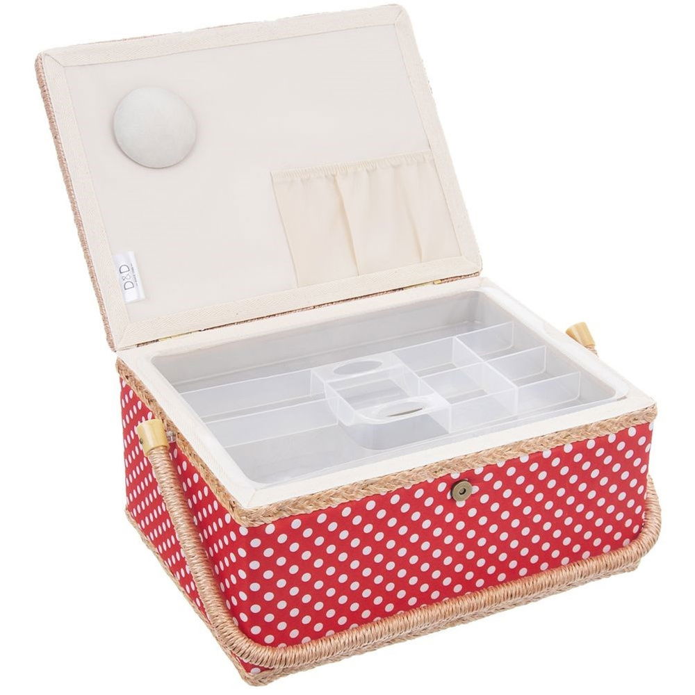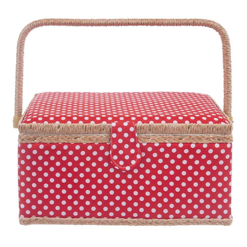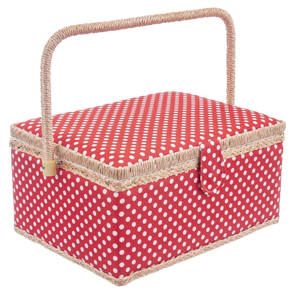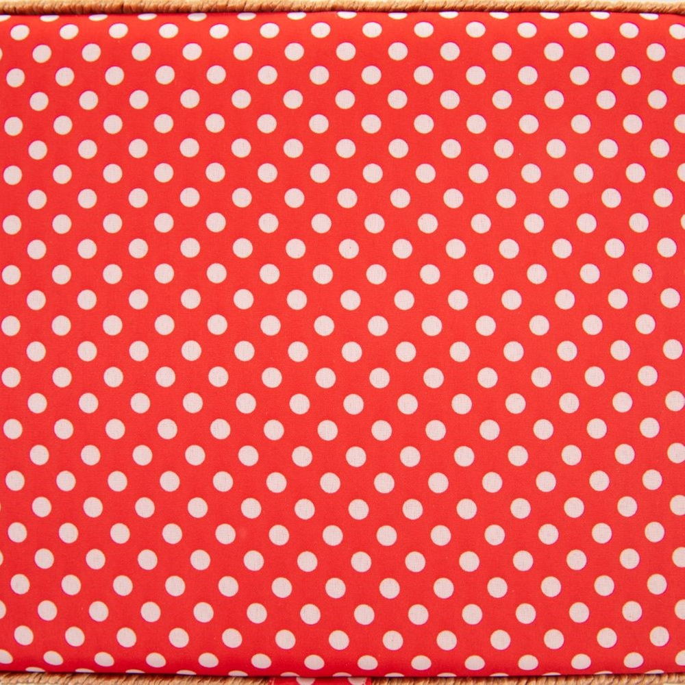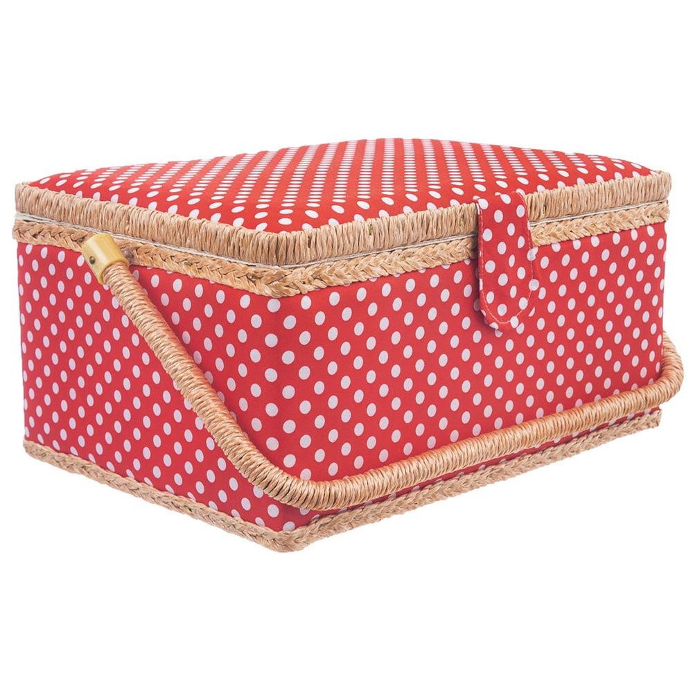CIEKAWY WZÓR - Wykonana z drewna obszytego materiałem w kolorze czerwonym w białe groszki. Koszyk posiada ciekawy design.