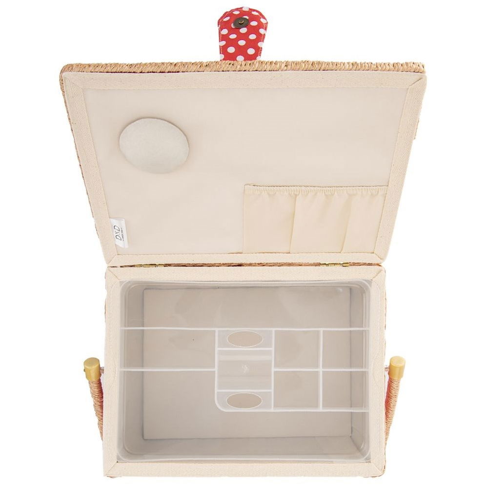 POJEMNA - Wewnątrz posiada wyciągany organizer wykonany z tworzywa w przezroczystym kolorze z 4 przegródkami, który pozwoli nam uporządkować akcesoria np. nici. Po jego wyciągnięciu znajduje się jedna komora do przechowywania akcesoriów krawieckich. W wewnętrznej części pokrywy jest kieszonka do przechowywania oraz poduszeczka, gdzie możemy wbić igły lub szpilki.