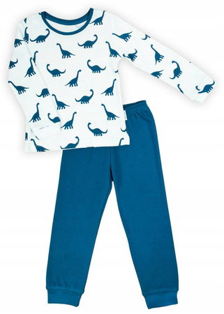 Wygodna bawełniana piżamka z kolekcji Iwo dla chłopca z długim rękawem. Posiada luźną białą bluzkę w morskie dinozaury. Spodnie w kolorze morskim posiadają w pasie wygodną gumkę, nie uciskającą brzuszka, dodatkowo została przeszyta, aby zapobiec okręcaniu się. Dół nogawek zakończono ściągaczem. Bawełna, z której jest uszyta, posiada certyfikat Oeko-Tex Standard 100 Tekstylia godne zaufania.
