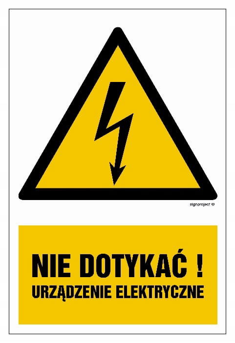 Wzór: Żółty trójkąt z czarną obwódką i piktogramem błyskawicy, uzupełniony czytelnym napisem: „Nie dotykać! Urządzenie elektryczne”.