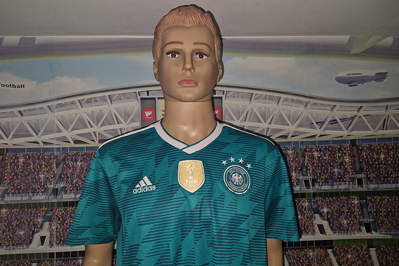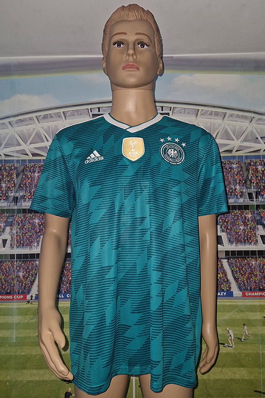 Oto dokładne wymiary tej piłkarskiej koszulki narodowej drużyny Niemiec - DFB (Deutscher Fussball-Bund), wyprodukowanej przez koncern Adidas /Climalite/: