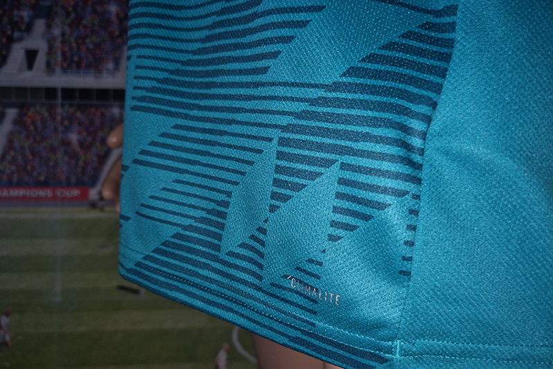Koszulka posiada krótkie rękawki i dominuje w niej kolor zielono - seledynowy wraz z biało – złoto – srebrnymi „dodatkami” zaś kołnierzyk tego piłkarskiego trykotu jest wykonany w stójkę.