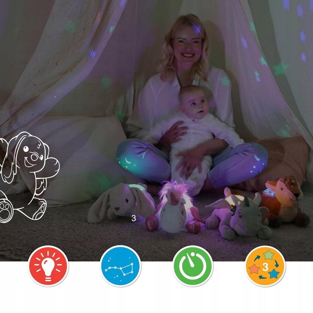 - Funkcjonalność: pluszaka można umieścić na podłodze, wyłączyć światła i cieszyć się pełnym, eterycznym efektem snu pod gwiazdami. Trzy kojące kolory tworzą wyjątkową atmosferę sprzyjającą pozytywnym nastrojom. Idealny dla maluchów i dzieci, pomaga złagodzić lęk przed ciemnością. Na suficie i ścianach wyświetlane jest gwiaździste niebo, księżyc oraz trzy konstelacje. W ciągu dnia stanowi zabawnego pluszowego przyjaciela, a w nocy – kojące źródło światła, stając się ulubionym towarzyszem dziecka do zabawy i zasypiania.