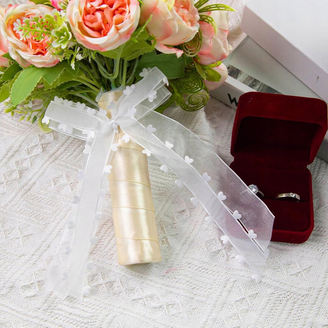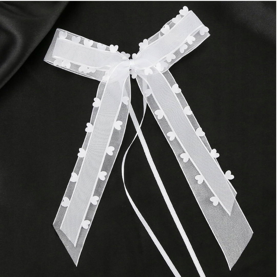 - Wysokiej jakości materiał: kokardy wykonane są z eleganckiej satynowej wstążki, ozdobionej dodatkową tasiemką z motywem serduszek, co nadaje im wyjątkowy, romantyczny wygląd.