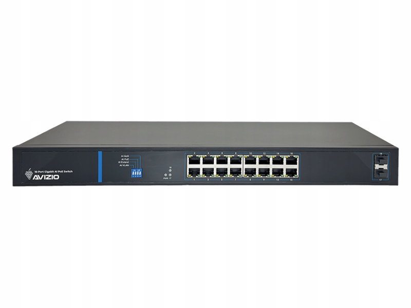 Niezarządzalny przełącznik (switch) 16 portów RJ45 PoE+ 1Gb/s + 2 porty SFP Uplink 1Gb/s (budżet mocy 150W) AVIZIO