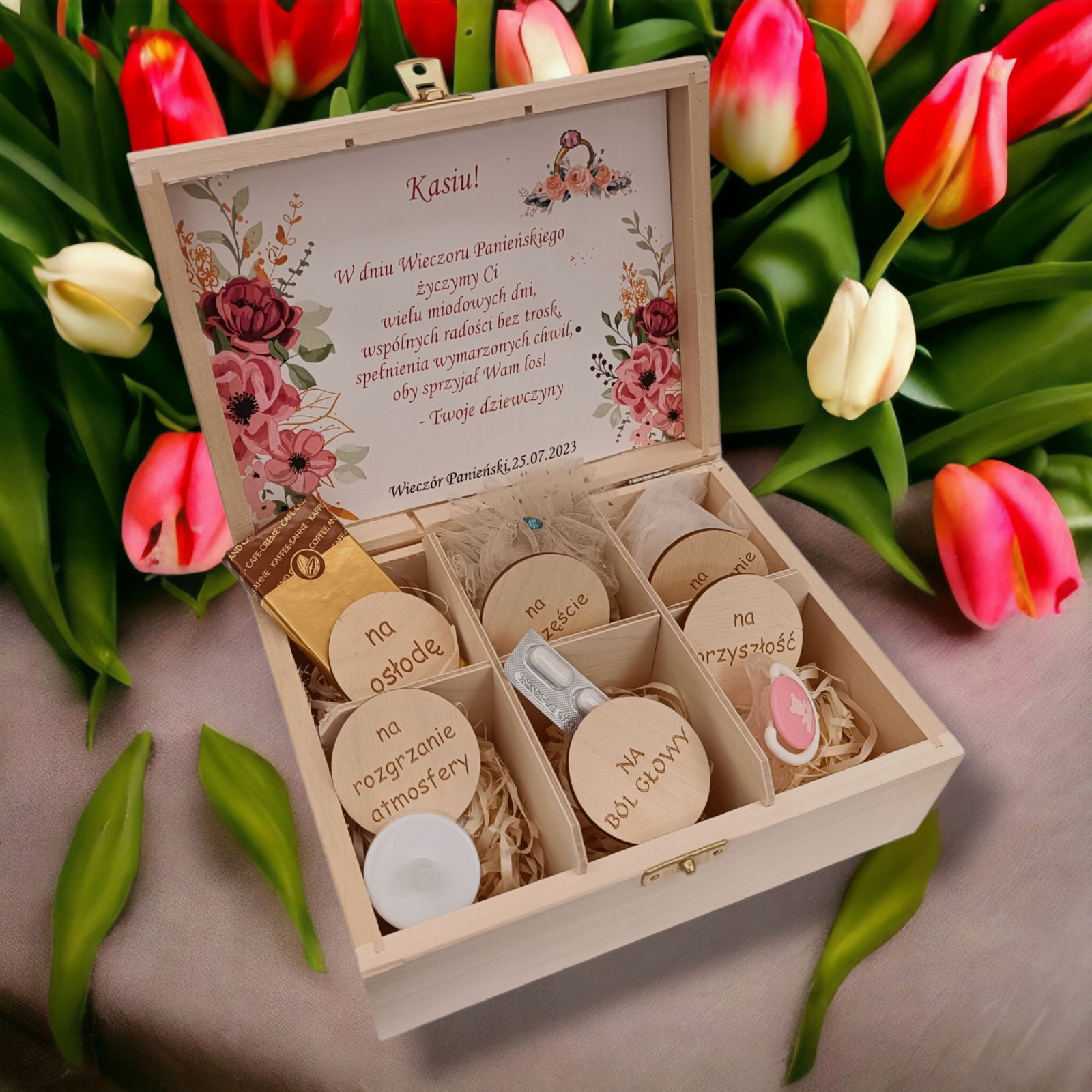 We wiadomości dla sprzedającego proszę o podanie podpisu pod życzeniami, imię Panny MłodeJ oraz daty wieczoru panieńskiego.