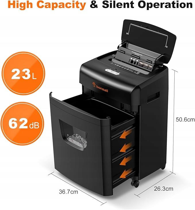 【Duża pojemność i przypomnienie o pełnym papierze】 Kosz na śmieci o pojemności 25 l może pomieścić około 500 arkuszy papieru, światło zmienia kolor na niebieski, gdy kosz jest pełen papieru. Uniwersalne kółka 360° i niski poziom hałasu zapewniają ciche i gładkie rozdrabnianie papieru.