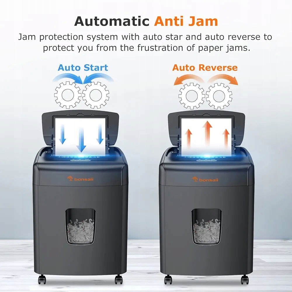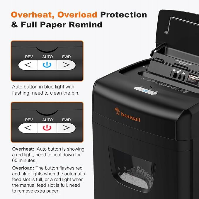 【Co może być Shred & Ochrona przed zacięciem】Należy pamiętać, że ta niszczarka do dużych obciążeń w trybie automatycznym może tylko rozdrabniać paer. Tryb ręczny może rozdrabniać karty kredytowe, spinacze do papieru i zszywki, tryb automatyczny nie może. Gdy zacina się papierze, możesz długo nacisnąć przycisk "REV", aby odwrócić plik.