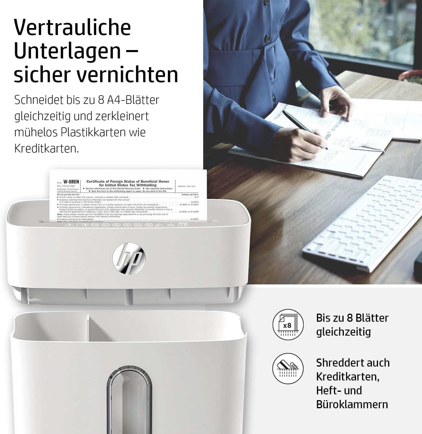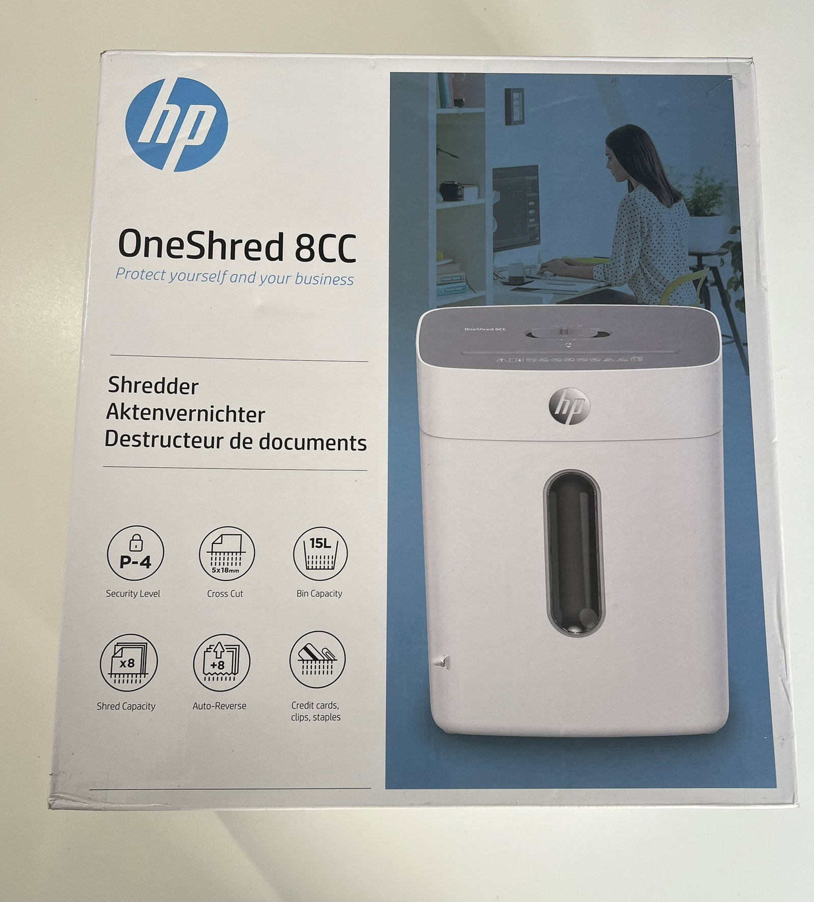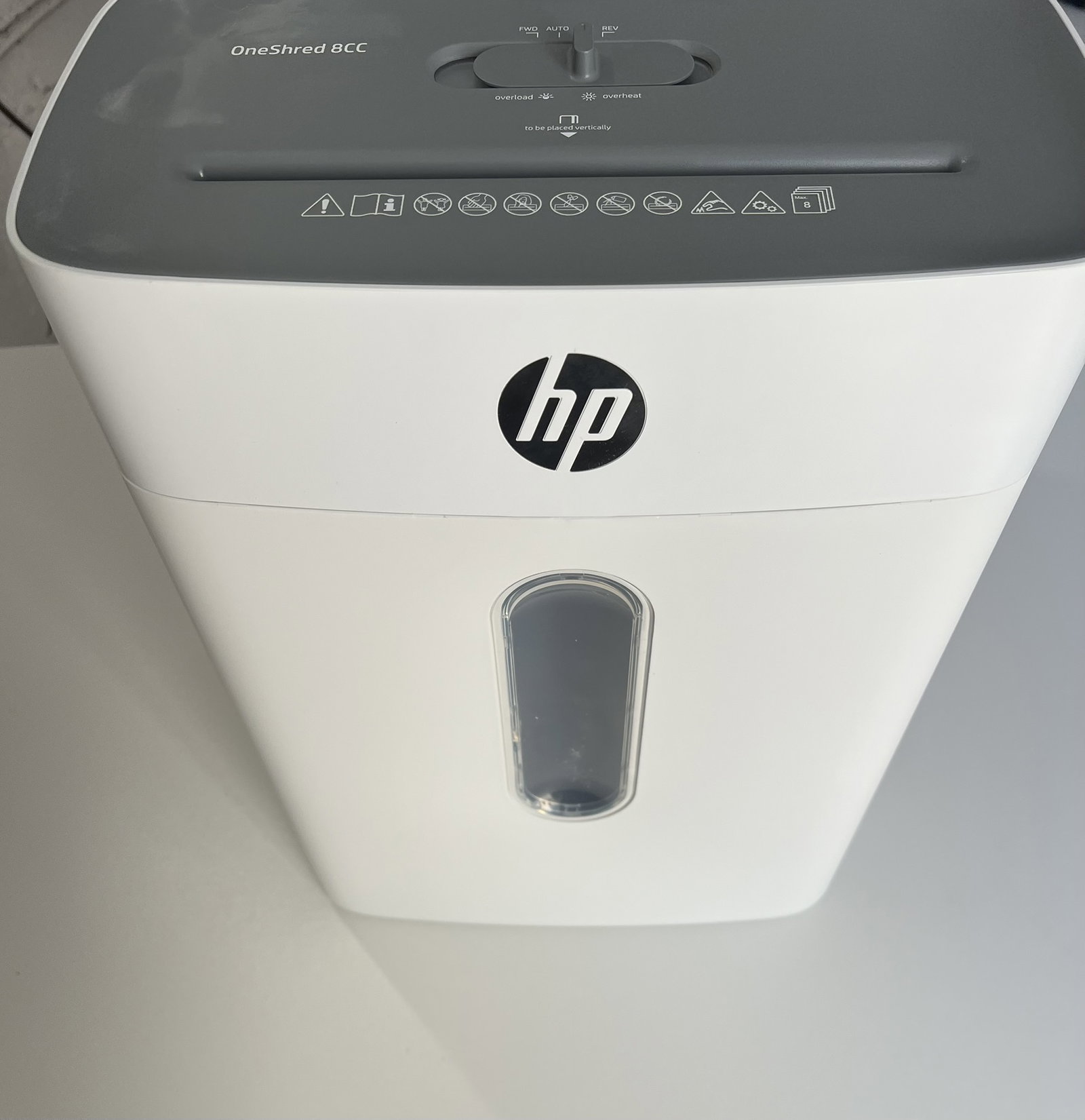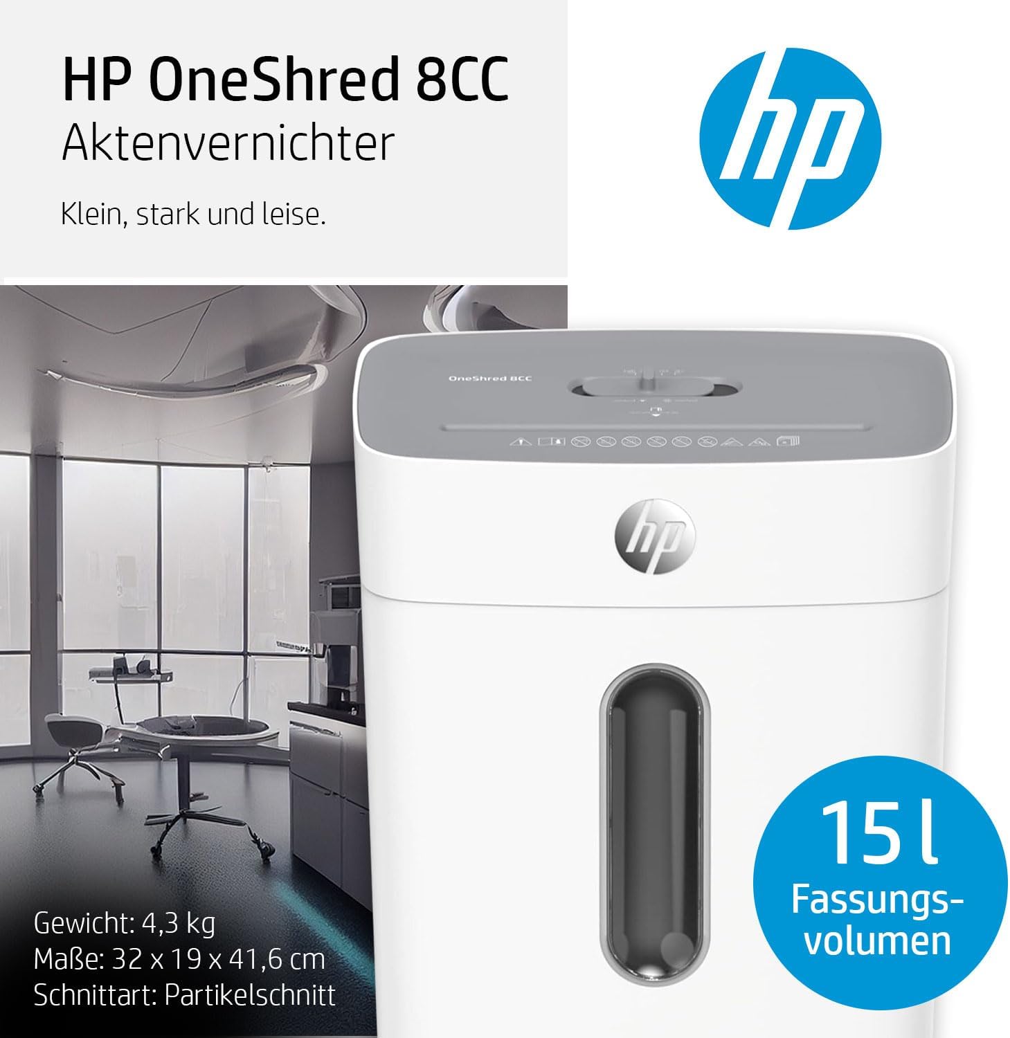 Niszczarka papieru HP OneShred 8CC P4 | Niszczarka papieru z cięciem poprzecznym na cząstki | Niszczarka papieru do domu i biura | Pojemność cięcia: 8 arkuszy | Niszczarka papieru z pojemnikiem na odpady o pojemności 15 l