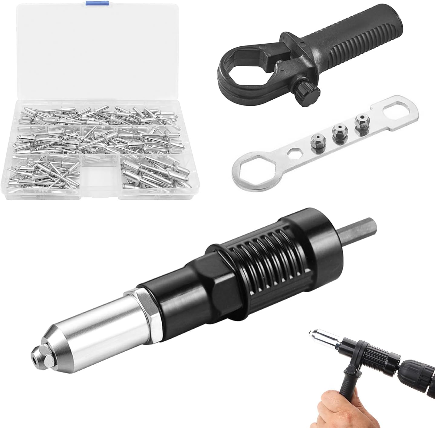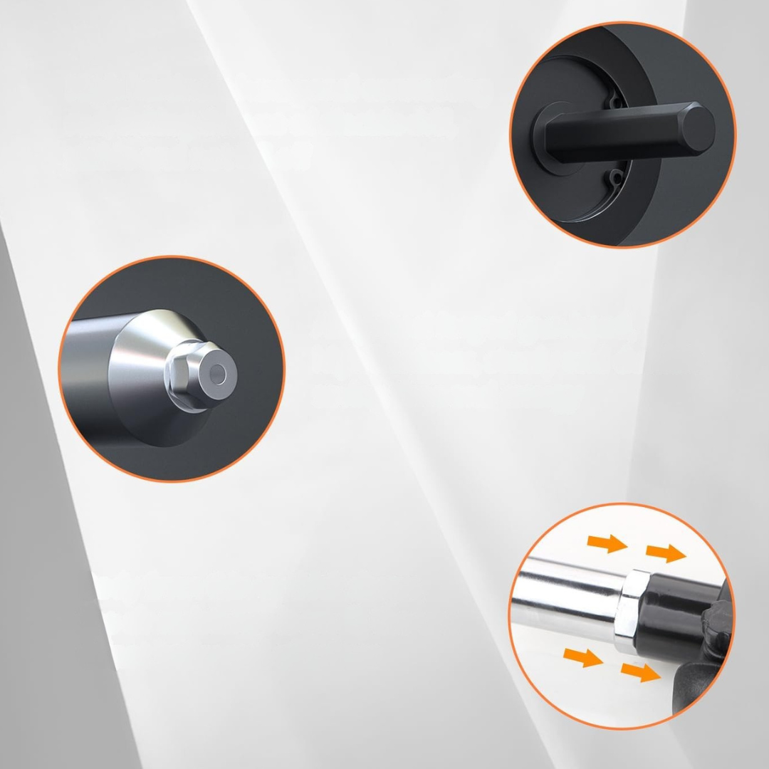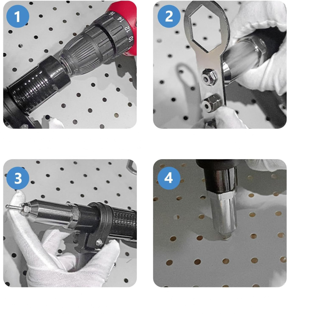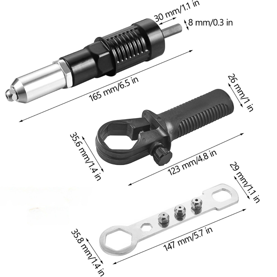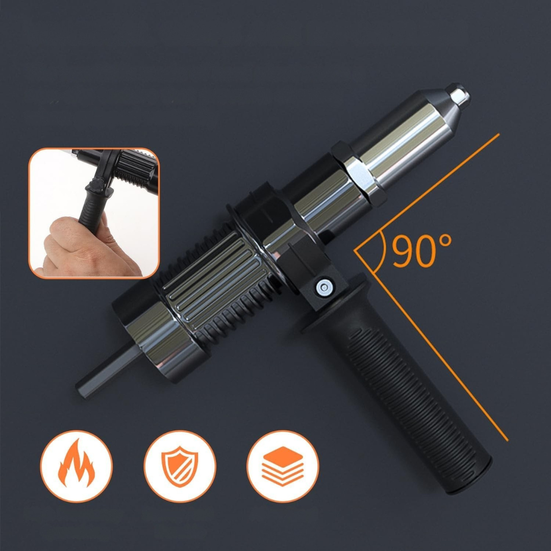 - Wydajność i funkcjonalność: aby uzyskać wydajny i szybki pistolet do nitów ślepych, wystarczy podłączyć adapter pistoletu do nitów do bezprzewodowej wiertarki elektrycznej. Projekt rowkowanego otworu na nit zapewnia, że nit nie wypada łatwo, co skutkuje szybszym rozwiązaniem problemu oraz oszczędnością czasu i energii.
