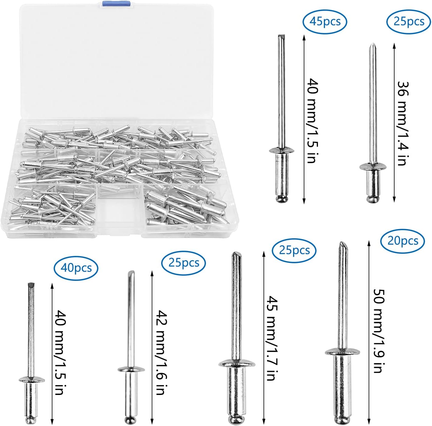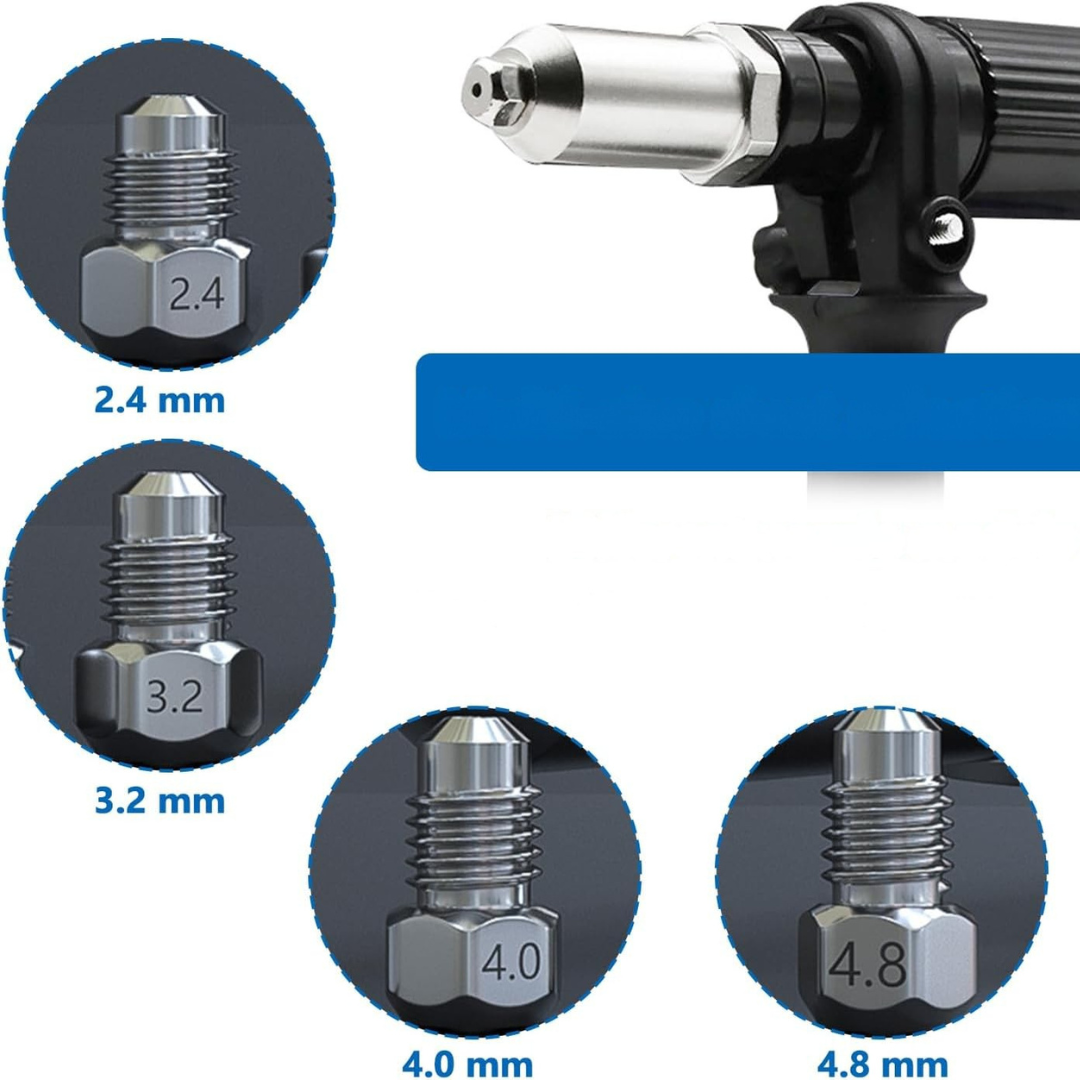 - Zawartość zestawu: 4 wymienne głowice nitujące o rozmiarach 2,4 mm, 3,2 mm, 4 mm i 4,8 mm, oraz 180 nitów w 6 różnych rozmiarach, po 30 sztuk z każdego, co umożliwia dopasowanie do różnych potrzeb nitowania.