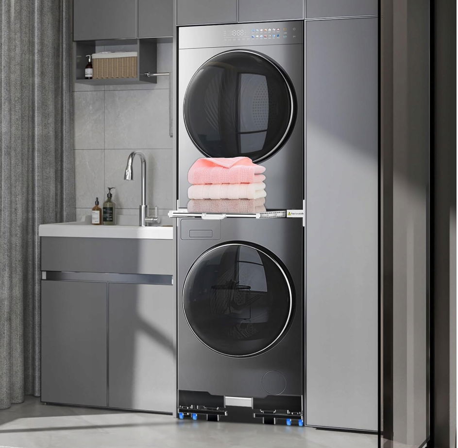 - ✴️Kółka i hamulce: Nasza podstawa pralki ma 4 stabilne nóżki i 10 plastikowych kółek, które bez wysiłku przesuwają urządzenie i są wyposażone w 2 wysuwane hamulce, które zapewniają bezpieczne mocowanie i amortyzację, dzięki czemu pralka i suszarka mocno zakotwiczone na podłodze