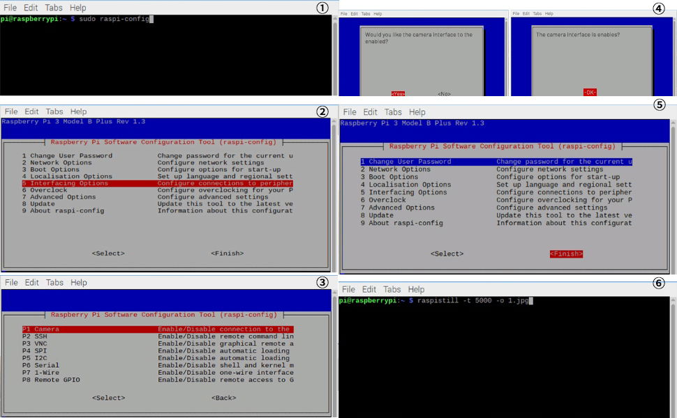 raspistill -t 5000 -o image.jpg , aby wykonać przechwytywanie obrazu (5000 oznacza przechwytywanie po 5 sekundach, można to zmienić).、