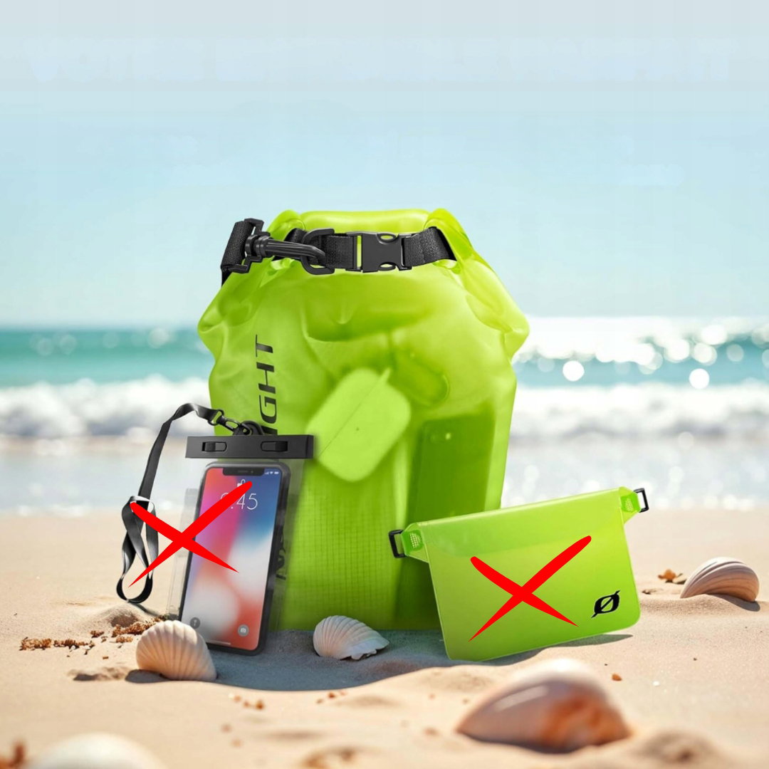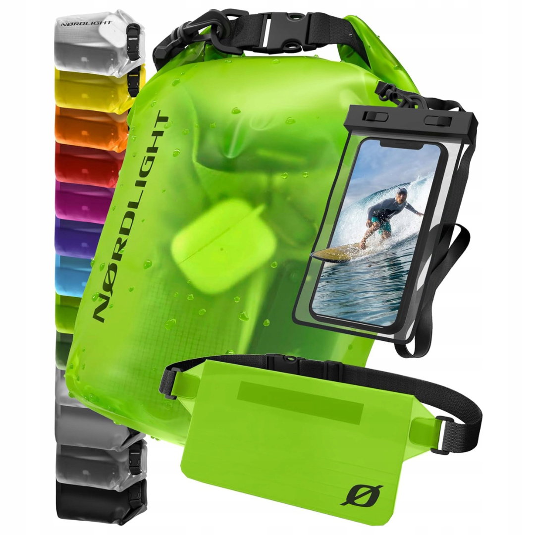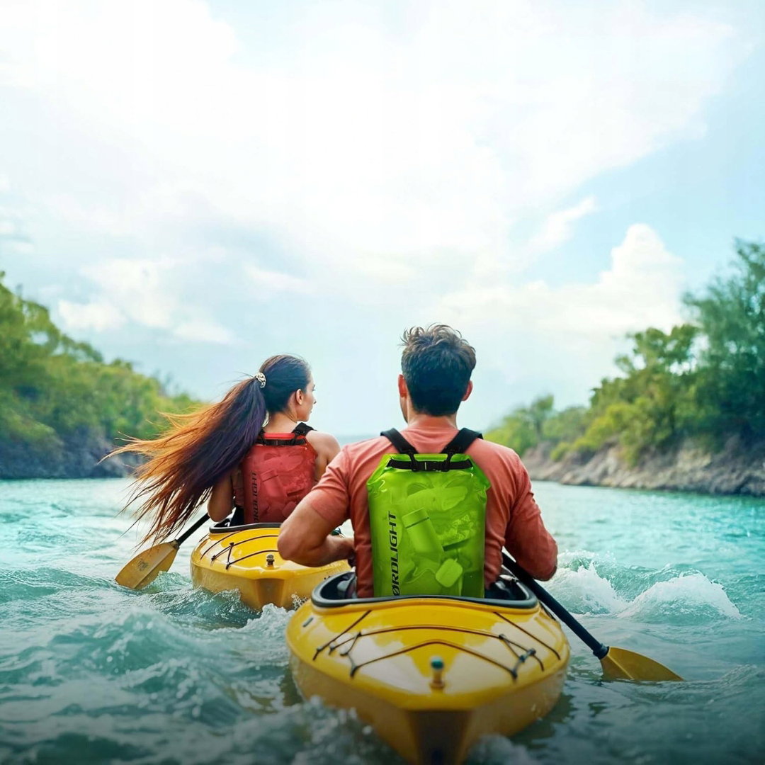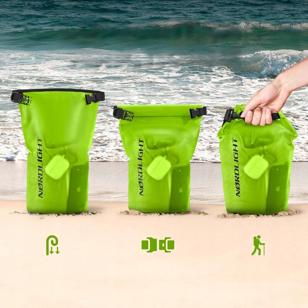 - Wodoodporna ochrona na lato: worki Dry Bag marki Nørdlight zapewniają skuteczną ochronę przed wilgocią, piaskiem oraz zabrudzeniami, pomagając utrzymać przechowywane przedmioty w suchym i bezpiecznym stanie. Aby prawidłowo zamknąć worek, górną krawędź należy zwinąć 3–4 razy, a następnie zapiąć klamry zabezpieczające. Pozostawienie niewielkiej ilości powietrza wewnątrz sprawia, że torba może utrzymywać się na powierzchni wody.