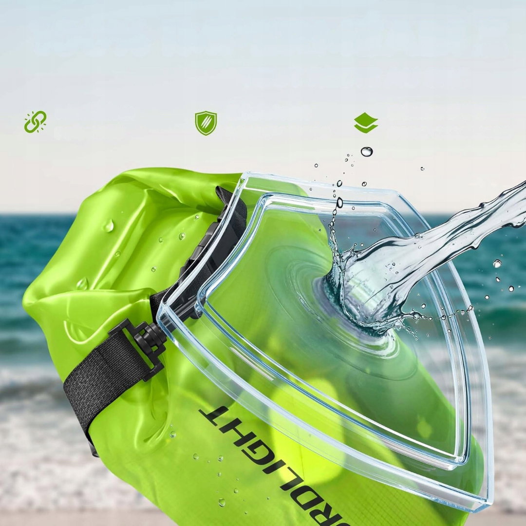 Wodoodporny worek Dry Bag 10L jest wykonany z wytrzymałego, szczelnego materiału o klasie wodoodporności IPX8, który skutecznie chroni zawartość przed wodą, piaskiem i zabrudzeniami.