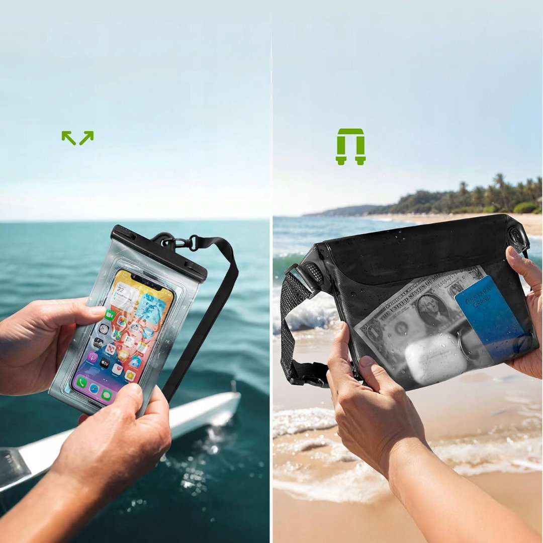 - Przezroczysta wodoodporna torba z wytrzymałego PVC: torba wykonana jest z trwałej, odpornej na zarysowania i uszkodzenia tkaniny PVC typu tarpaulin. Materiał bezszwowy zapewnia wysoką szczelność, a jednocześnie pozostaje lekki i wyjątkowo wytrzymały. Przezroczysta konstrukcja ułatwia szybkie zlokalizowanie potrzebnych przedmiotów bez konieczności otwierania torby.