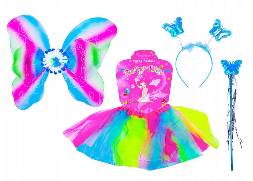 Strój motyl składa się z tiulowej spódniczki, skrzydeł z kwiatkiem, opaski z motylkami oraz różdżki. Jest to strój idealny na różnego rodzaju imprezy, takie jak karnawał, Halloween, urodziny, itp.