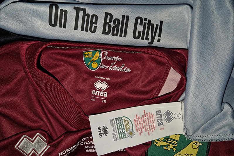 Piłkarska koszulka drużyny występującej w angielskiej EFL Championship – Norwich City F.C. (Norwich City Football Club), wyprodukowana przez koncern Errea /Canaries Official/.