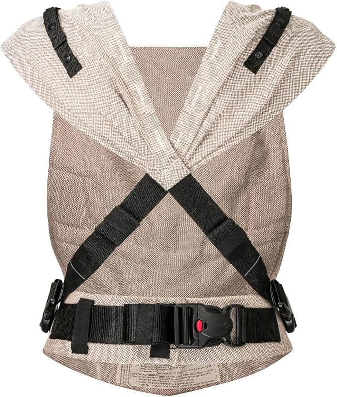 Z łatwo regulowanymi klamrami na pasie biodrowym i paskach na ramię. Można stosować jako nosidełko na brzuch i plecy.