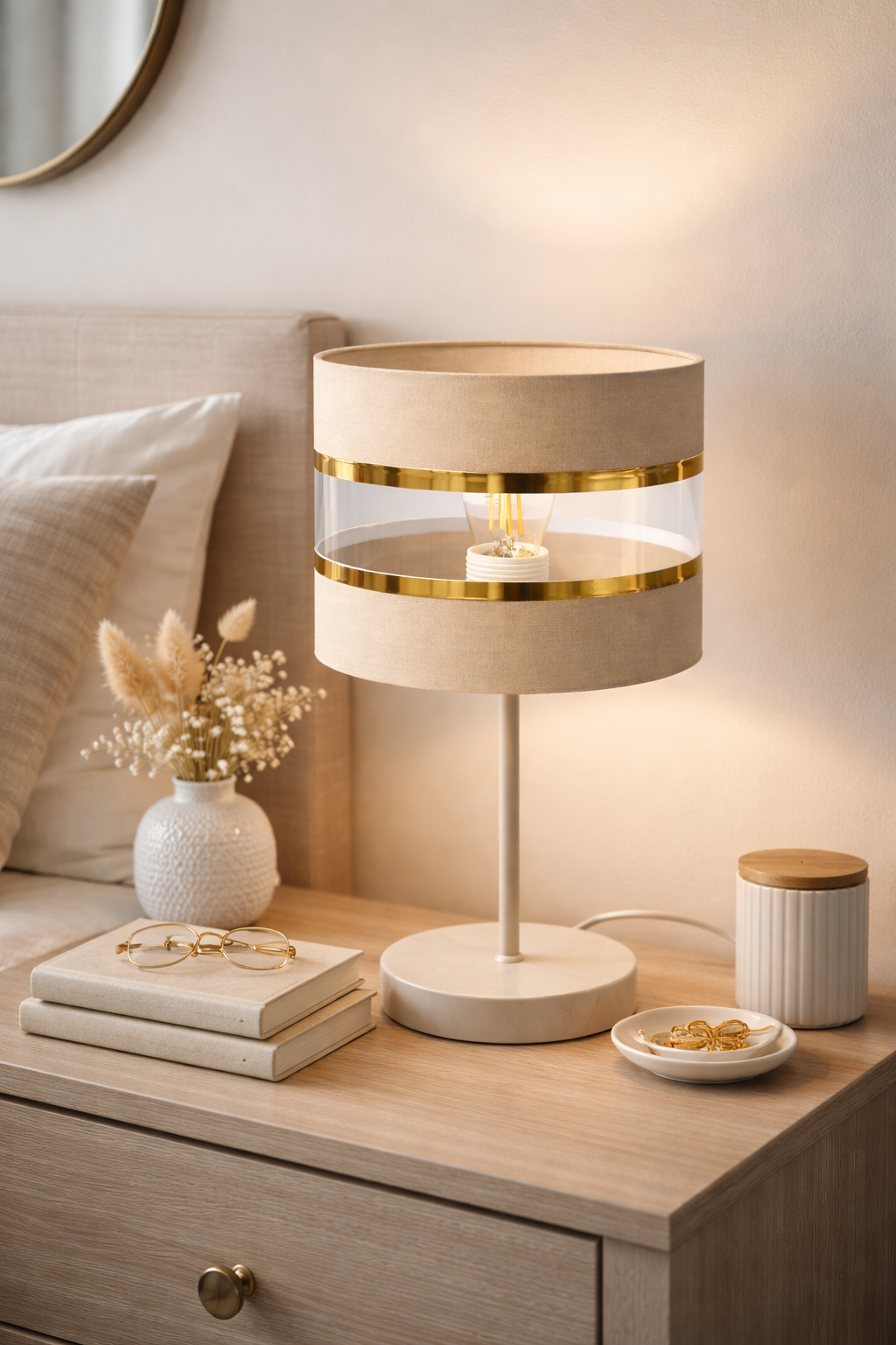 - Kolor podstawy i abażuru: kaszmir + złoto