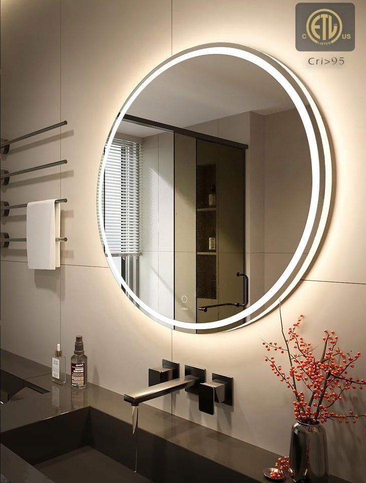 KWW Duże nowoczesne okrągłe lustro LED do łazienki, regulacja temperatury barwowej, montowane na ścianie, przeciwmgielne, ściemniane światła, lusterko do makijażu (sterowanie dotykowe, 60 x 60 cm) [Klasa energetyczna F]