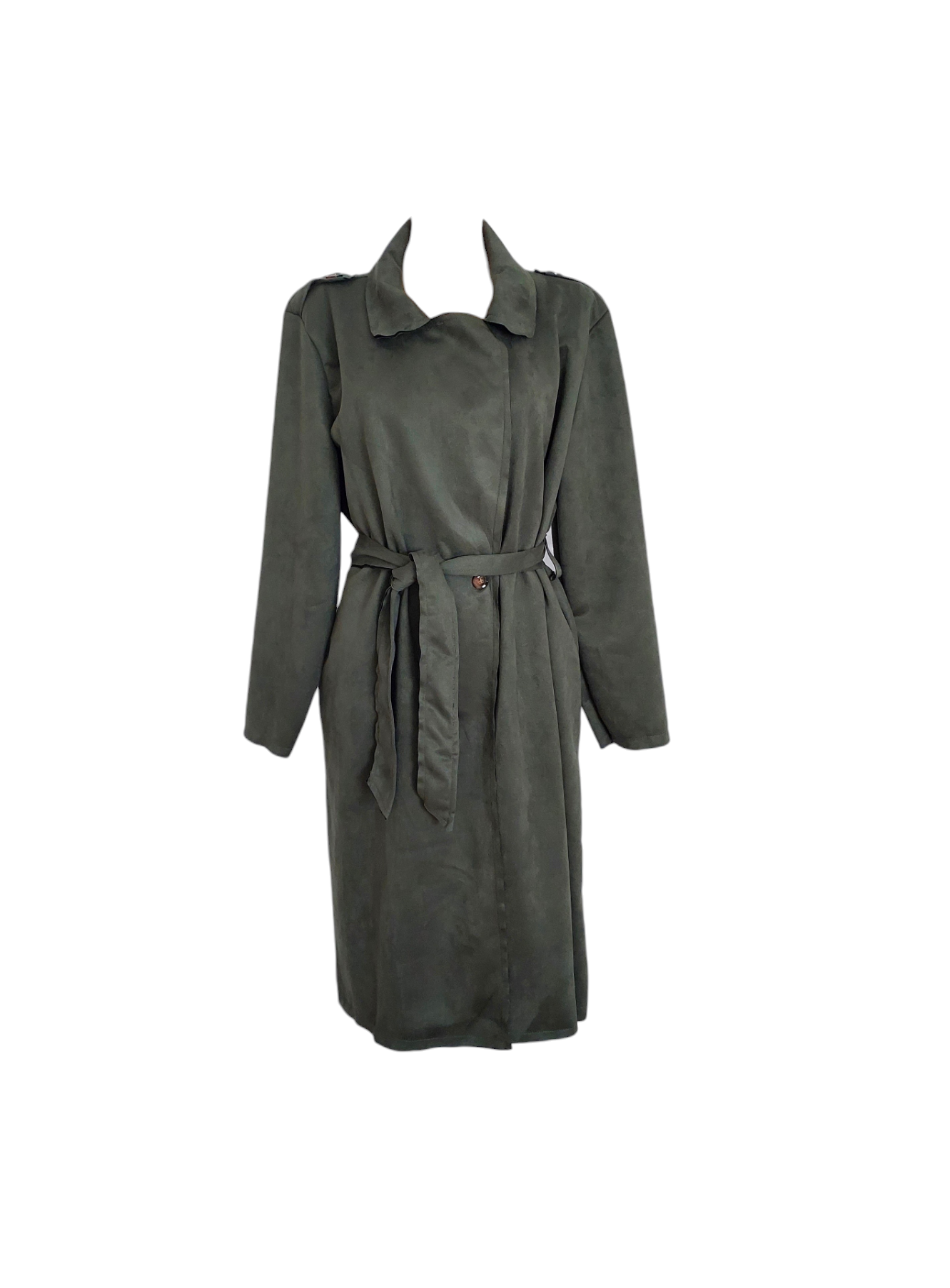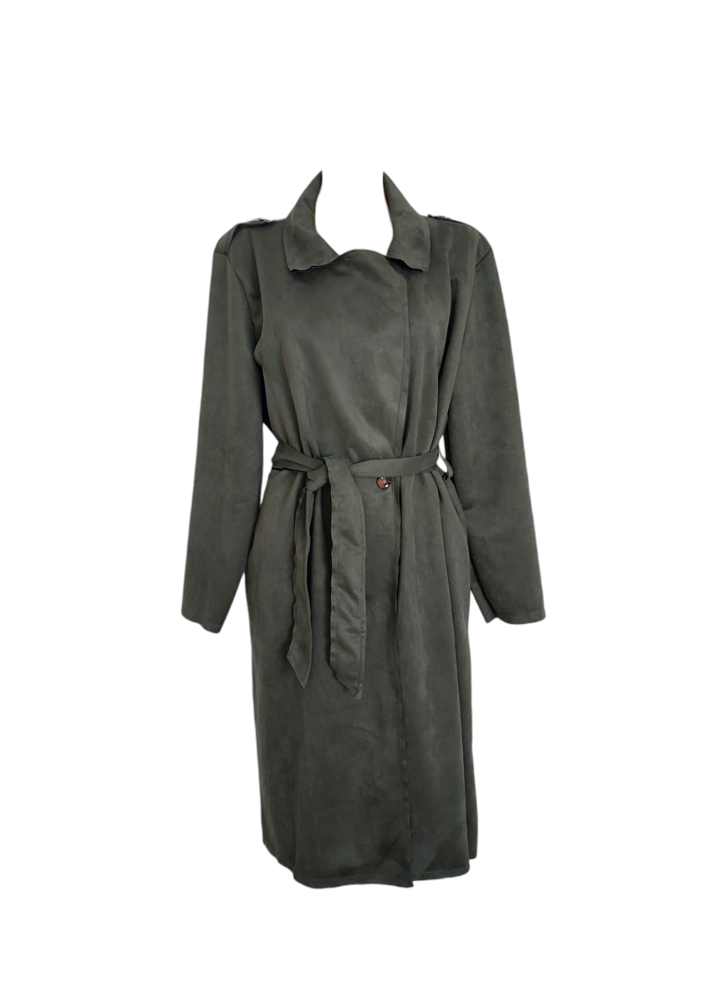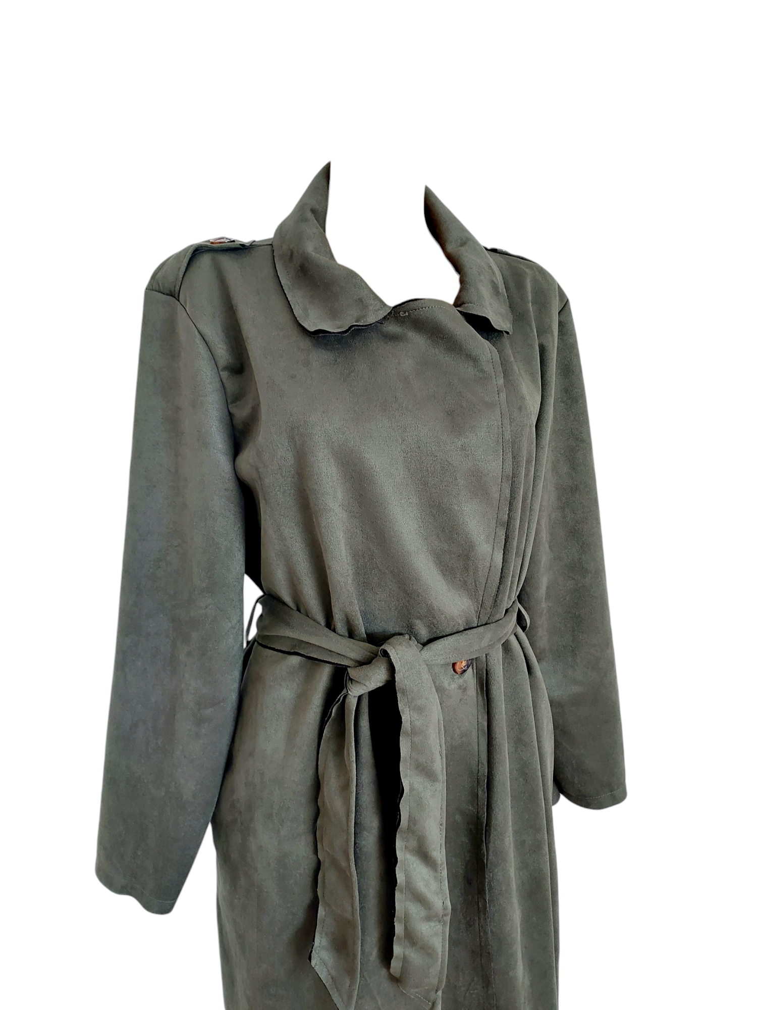 Nowy Jesienny Zamszowy Płaszcz Trencz Z Paskiem I Kieszeniami Khaki OliwkaNowy Jesienny Zamszowy Płaszcz Trencz Z Paskiem I Kieszeniami Khaki Oliwka