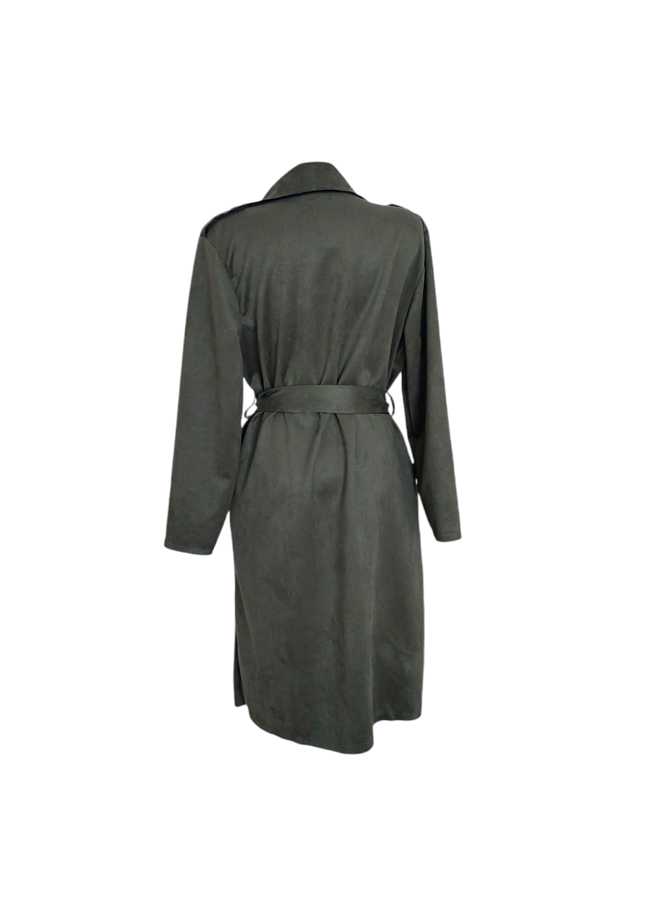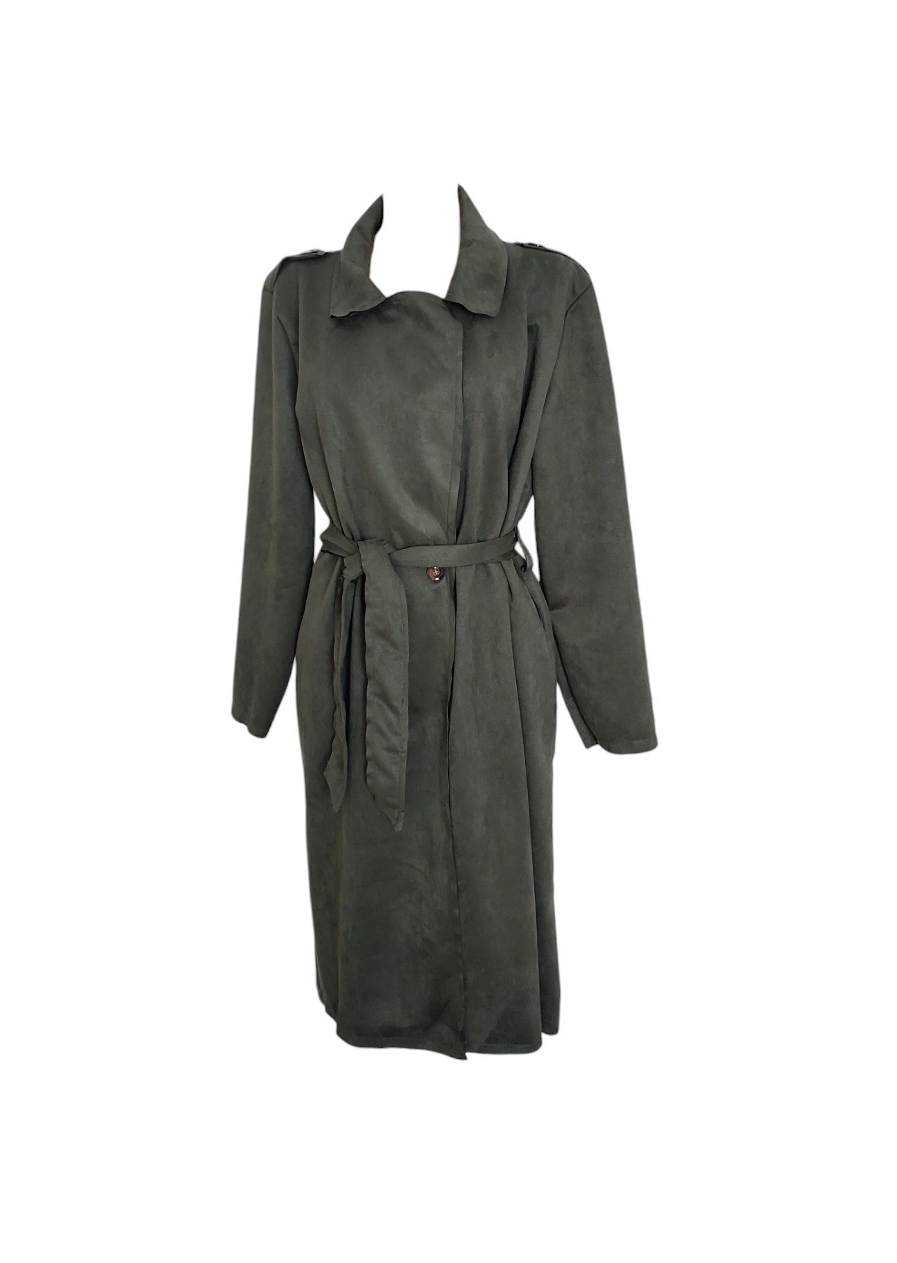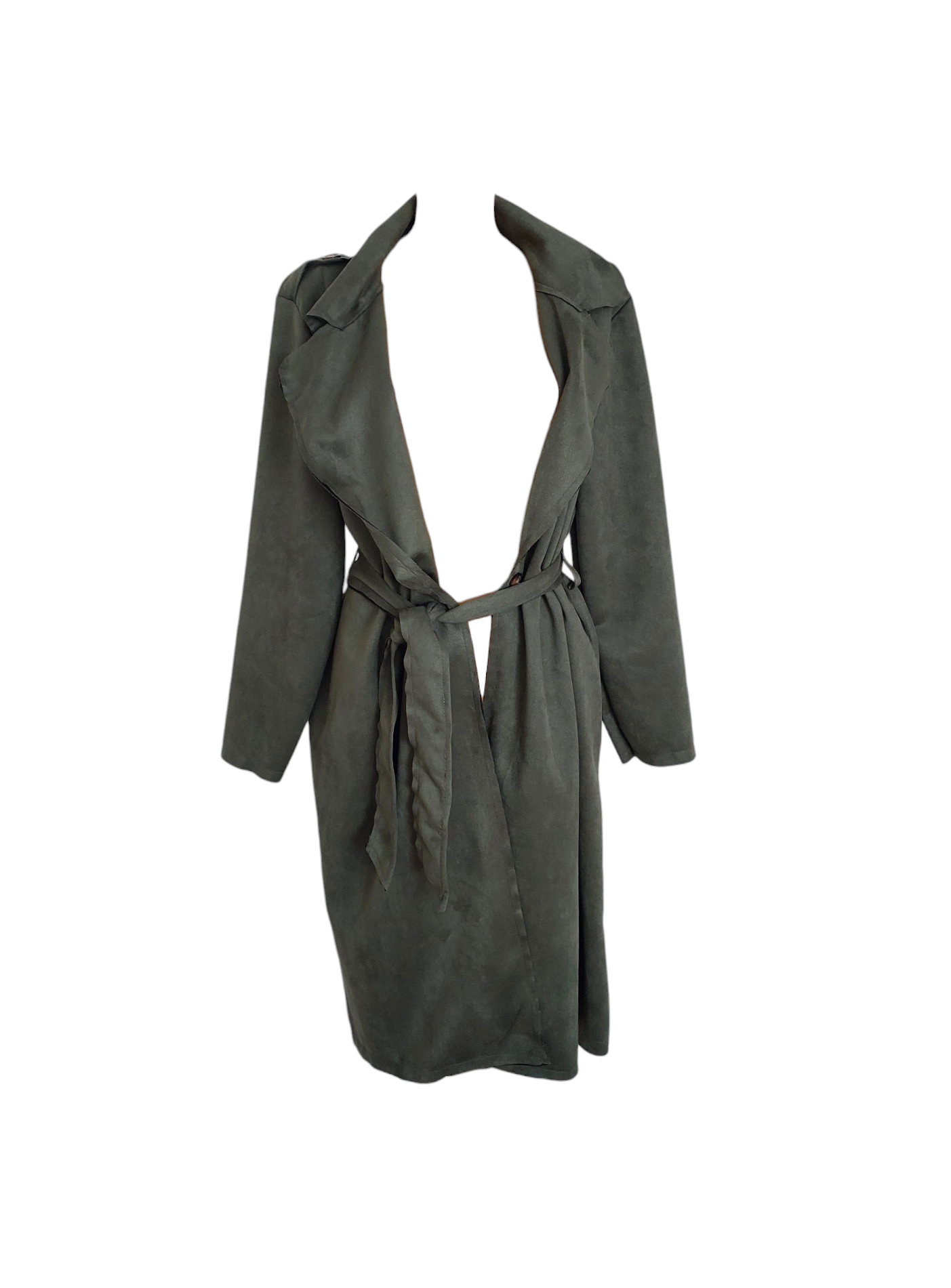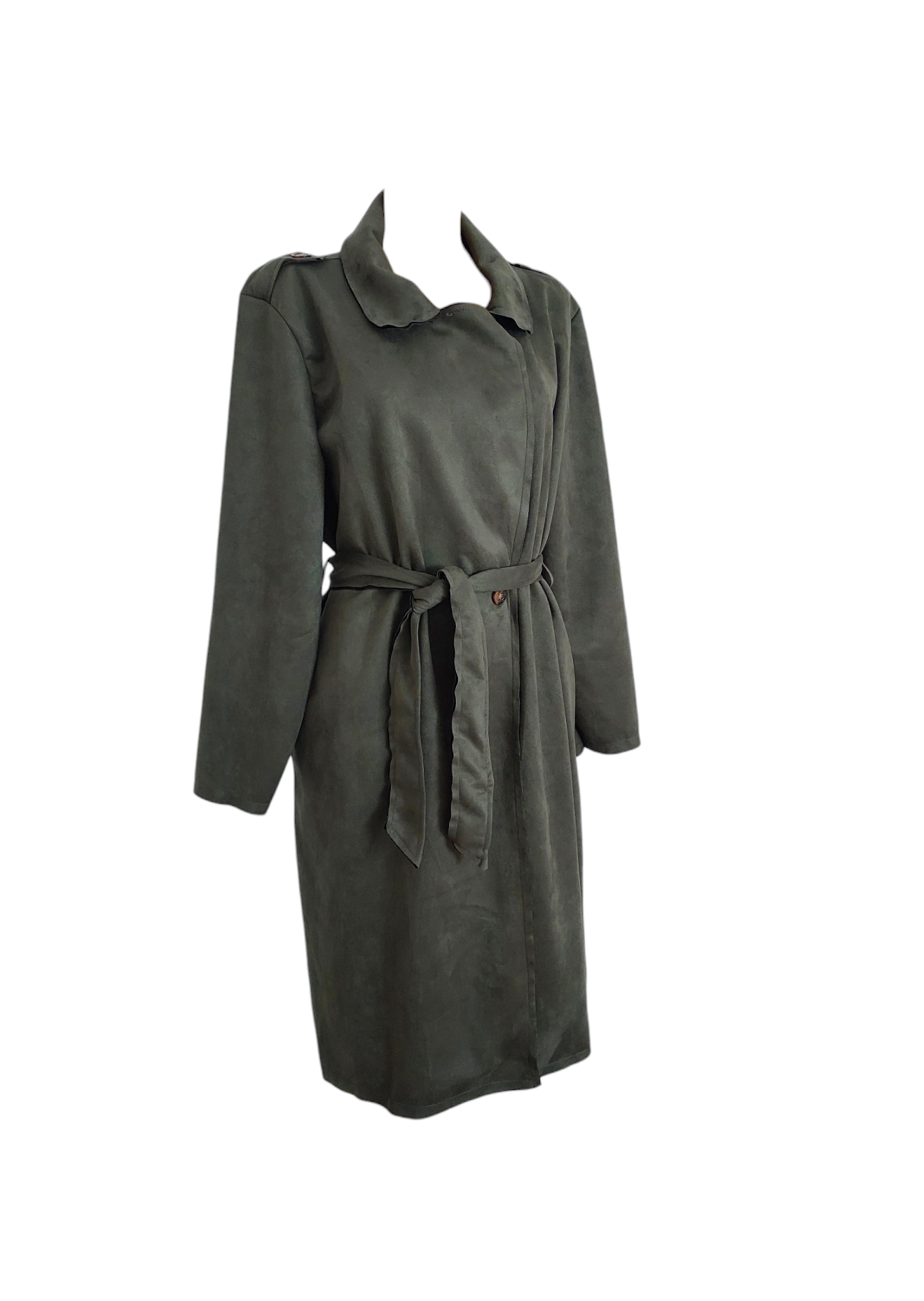 Nowy Jesienny Zamszowy Płaszcz Trencz Z Paskiem I Kieszeniami Khaki OliwkaNowy Jesienny Zamszowy Płaszcz Trencz Z Paskiem I Kieszeniami Khaki Oliwka