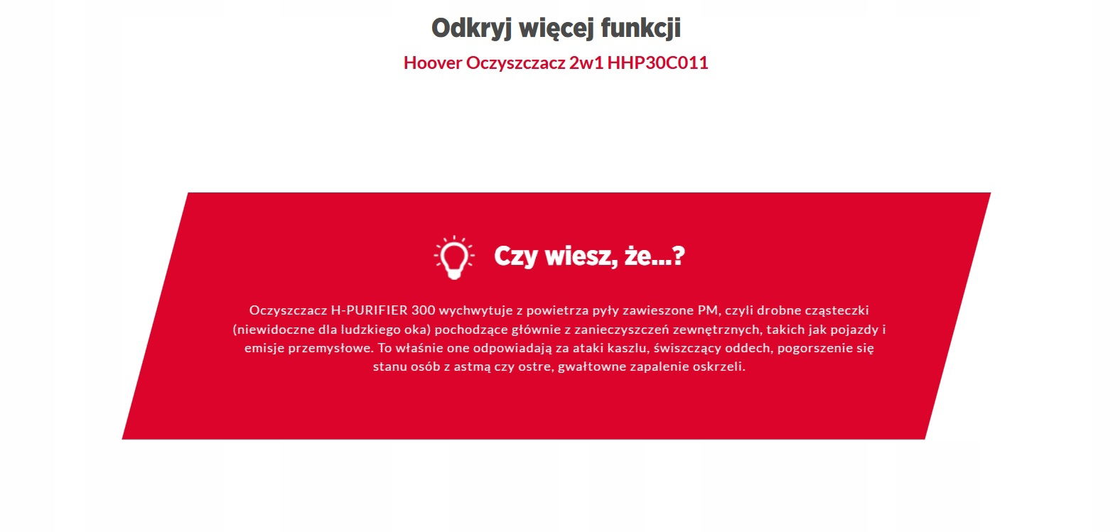 - Czy oczyszczacze Hoover radzą sobie ze smogiem?Tak. Oczyszczacze Hoover posiadają 3-warstwowy system filtracji, który zapewnia wszechstronne oczyszczanie powietrza z gazów, pyłków oraz pyłów zawieszonych (PM 10, PM 2,5). Te ostatnie należą do groźnych dla zdrowia składników smogu.