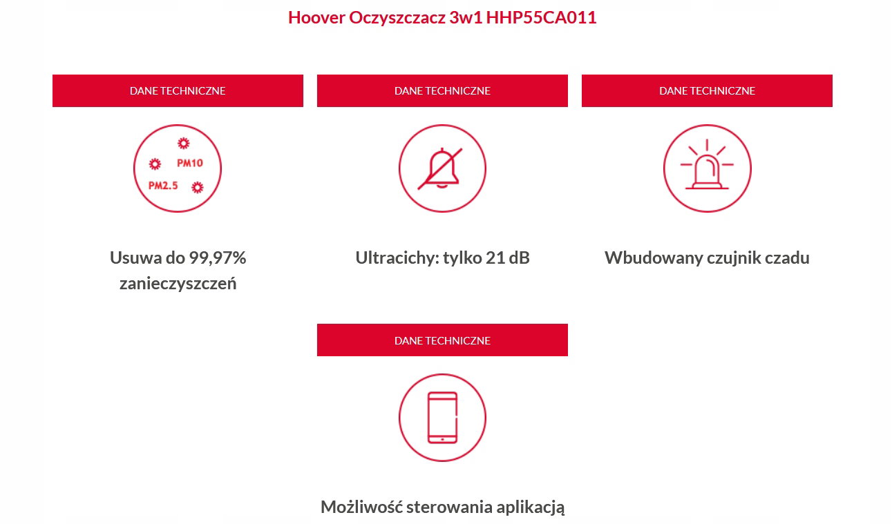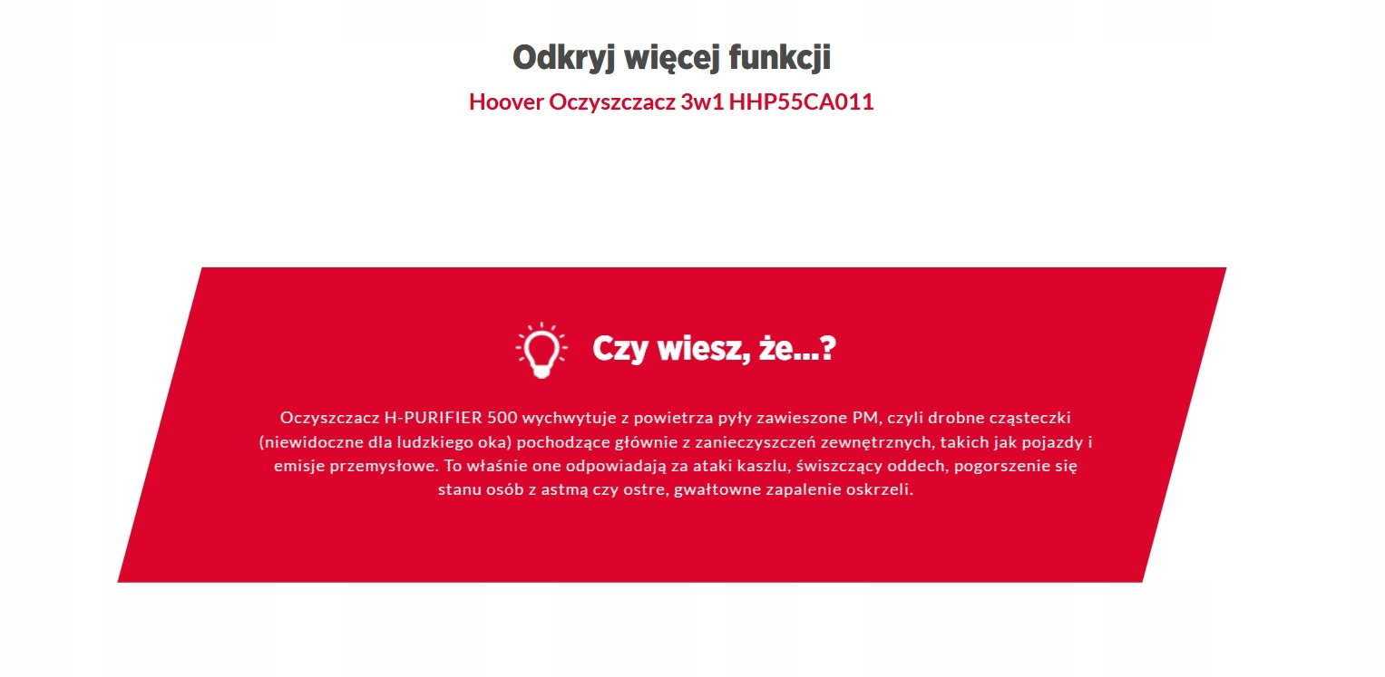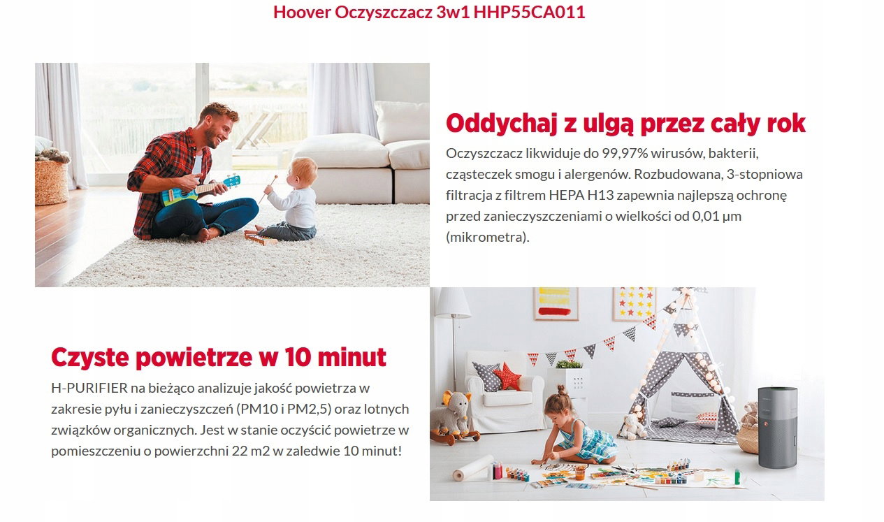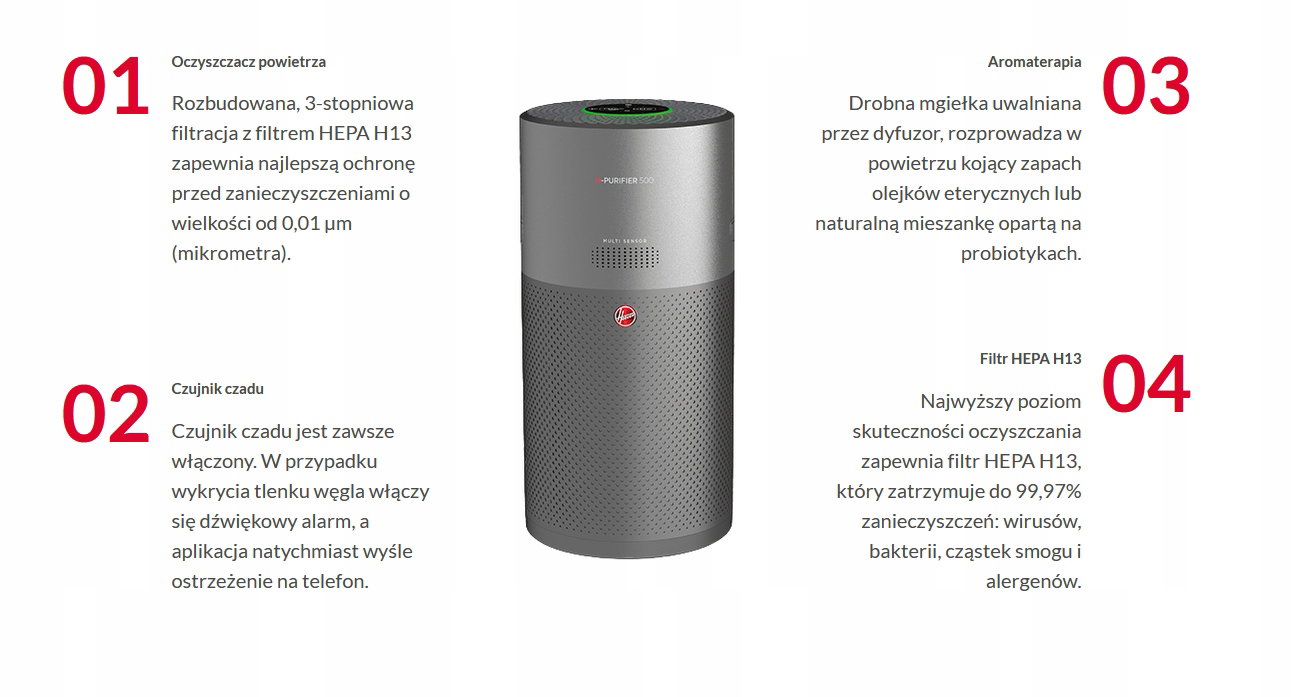 - Czy oczyszczacze Hoover radzą sobie ze smogiem?Tak. Oczyszczacze Hoover posiadają 3-warstwowy system filtracji, który zapewnia wszechstronne oczyszczanie powietrza z gazów, pyłków oraz pyłów zawieszonych (PM 10, PM 2,5). Te ostatnie należą do groźnych dla zdrowia składników smogu.